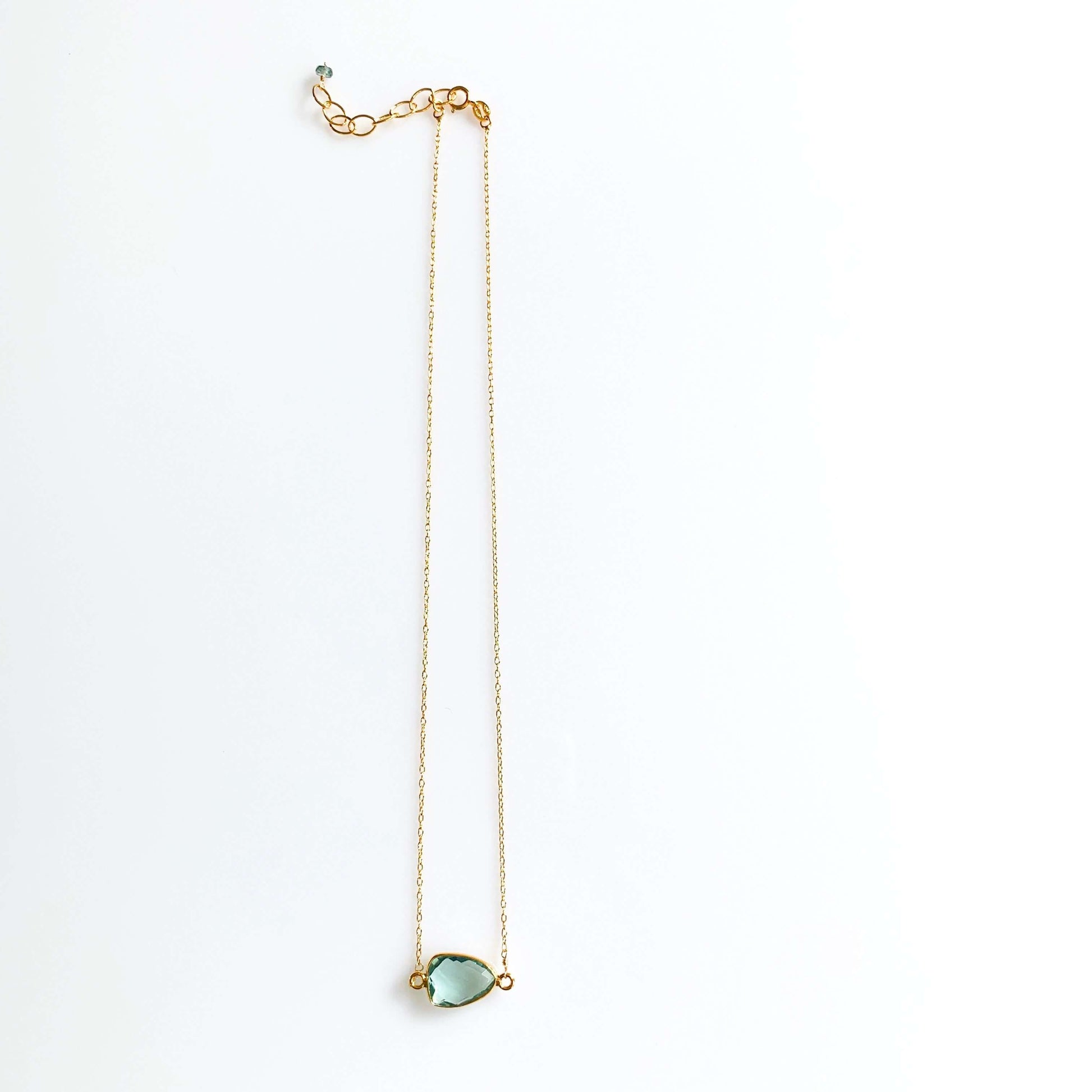 Simple, gold necklace with beautiful green amethyst bezel set gemstones. Great for layering.