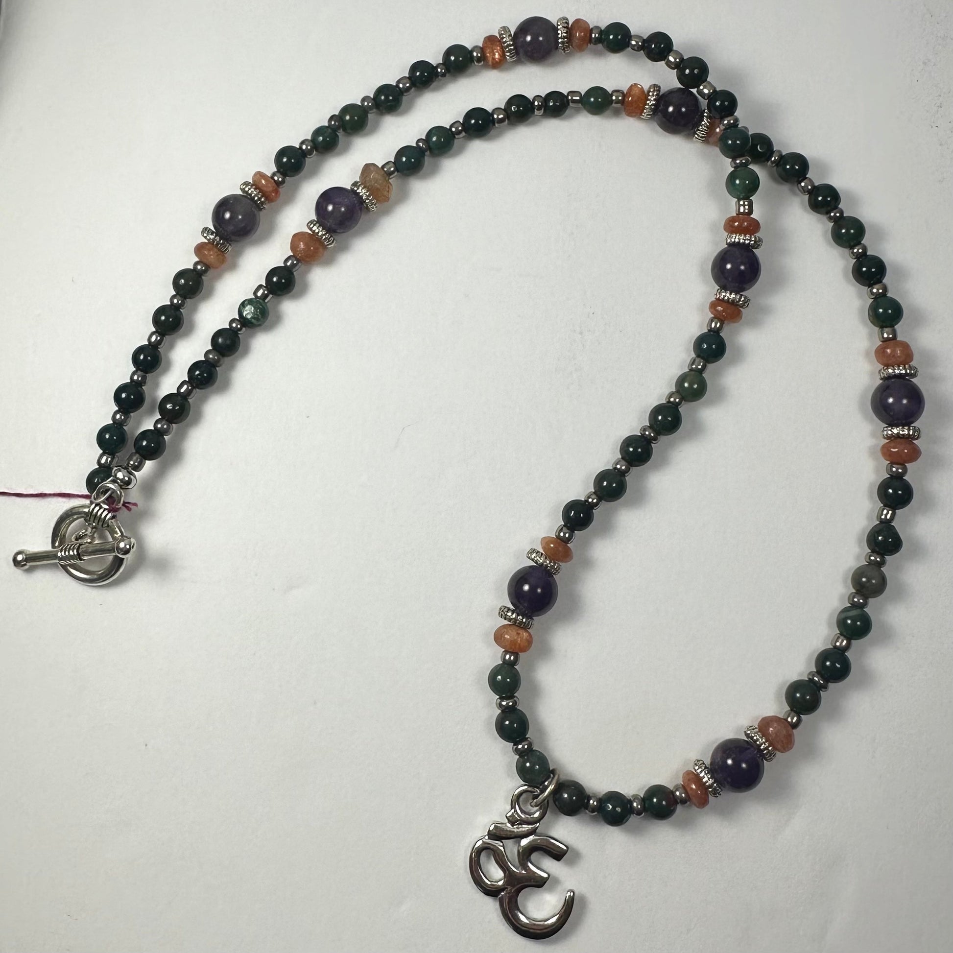 .925 Sterling Silver Om Pendant on Amethyst, Sunstone and African Bloodstone necklace