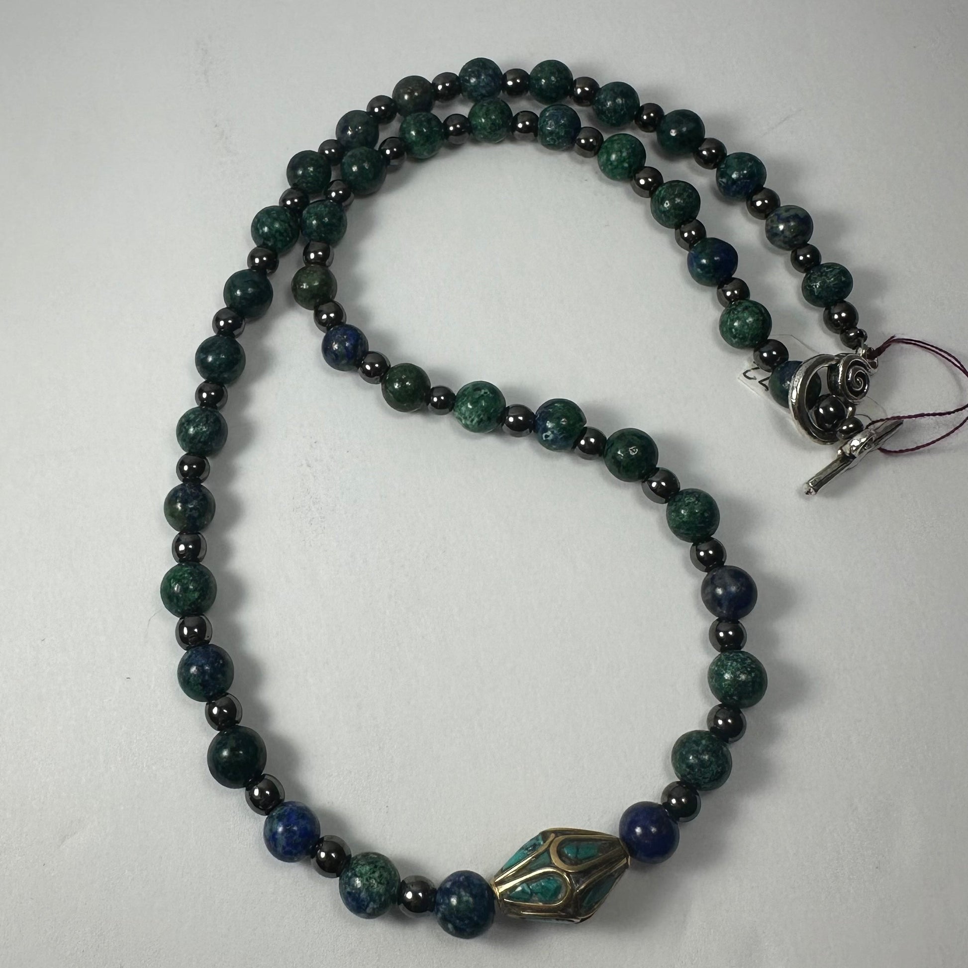 Tibetan Brass & Turquoise pendant on Lapis, Malachite and Hematite bead necklace