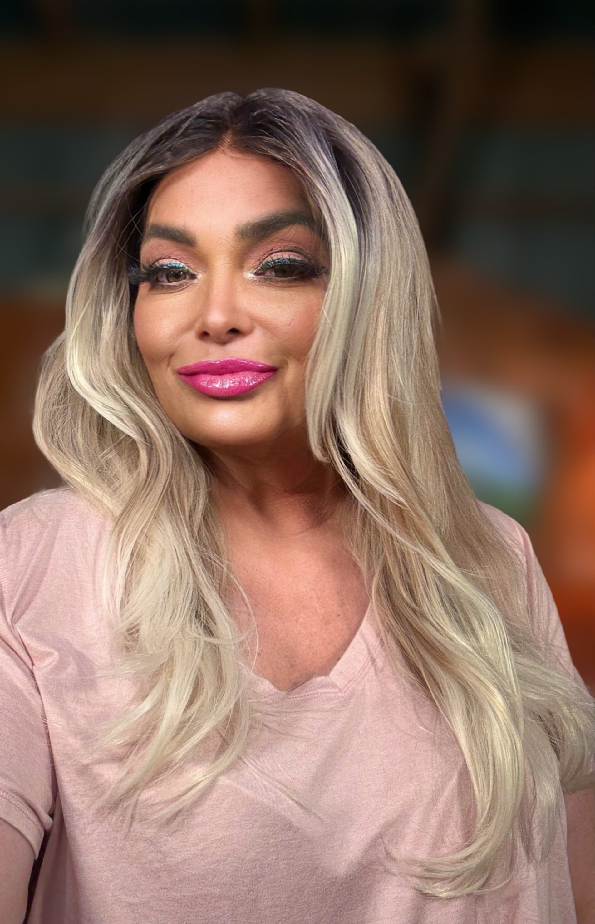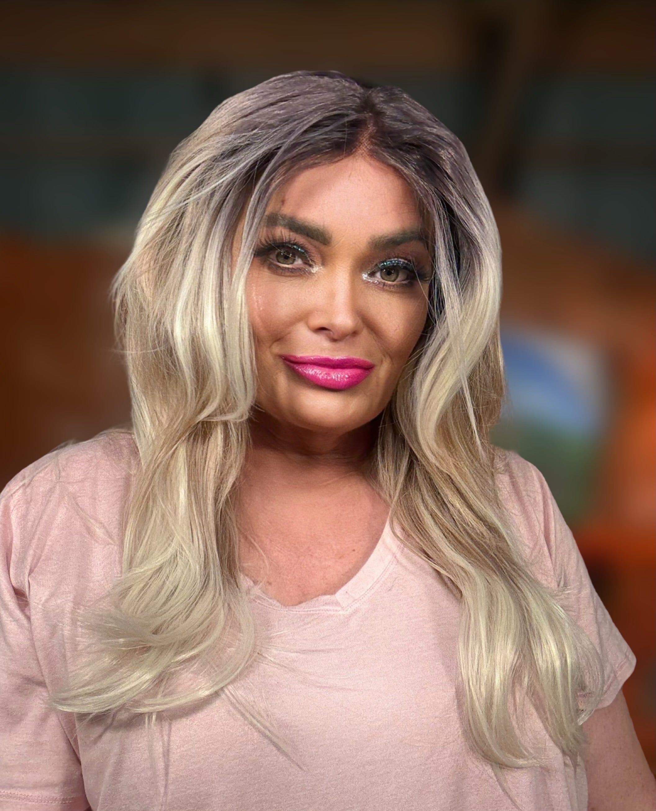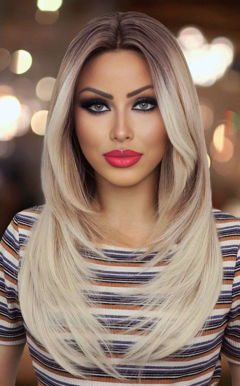 HONEY BLUSH is a premium lace front T part wig made with heat resistant synthetic fiber. Measuring 24 inches and featuring layers, curtain bangs, and a stunning blush and blonde color, it is adjustable with adjustable straps and a standard cap size. Supplier direct shipped to ensure quality.