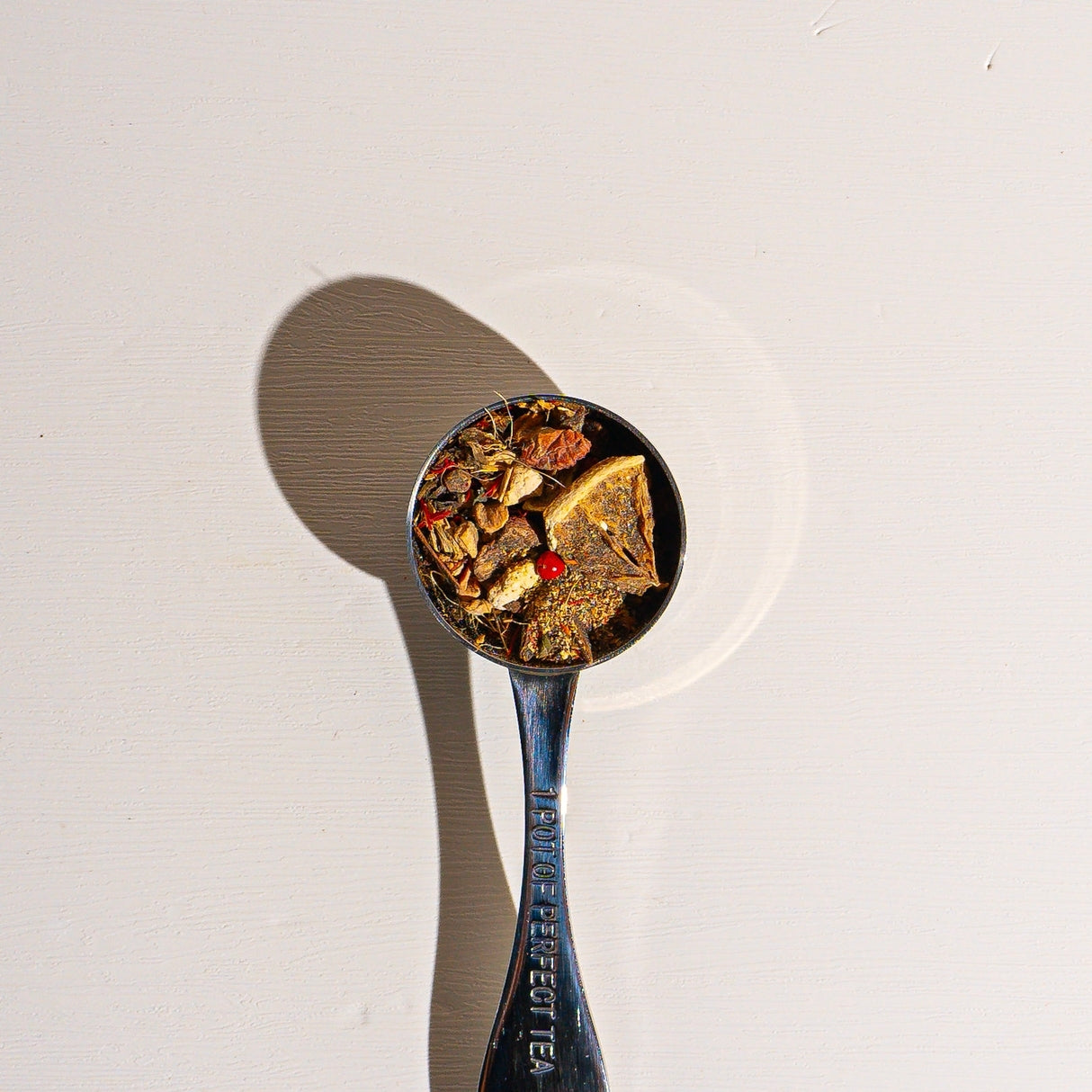 Luxury Ingredients: Ginger, Tulsi (Holy Basil), Cinnamon, Anise, Orange + Apple pieces, Star Anise, Pink peppercorns, Orange slices, Safflower petals