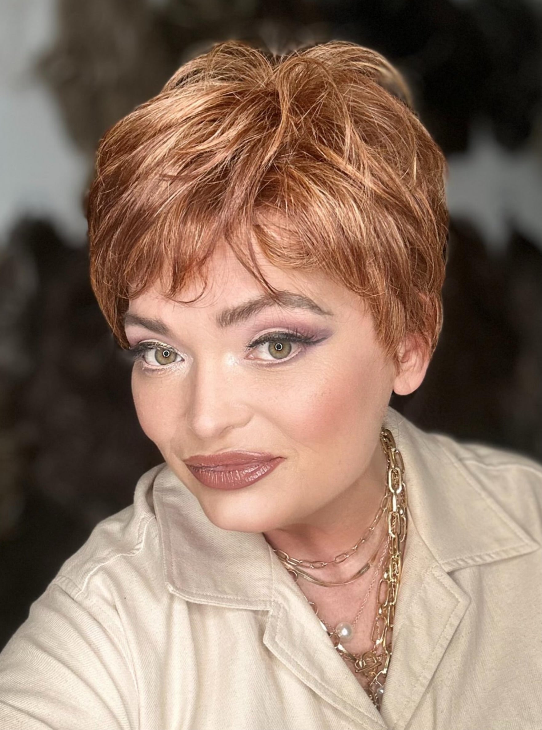 Experience the ultimate in luxury with JASMINE Mono! This high-quality wig features a full mono design and filament lace front for a natural look. The free part allows for versatile styling, while the pixie cut with layering adds an adorable touch. The non-rooted copper color is perfect for a fresh and stylish look. With adjustable Velcro straps and a range of cap sizes, this wig is sure to fit comfortably and beautifully.