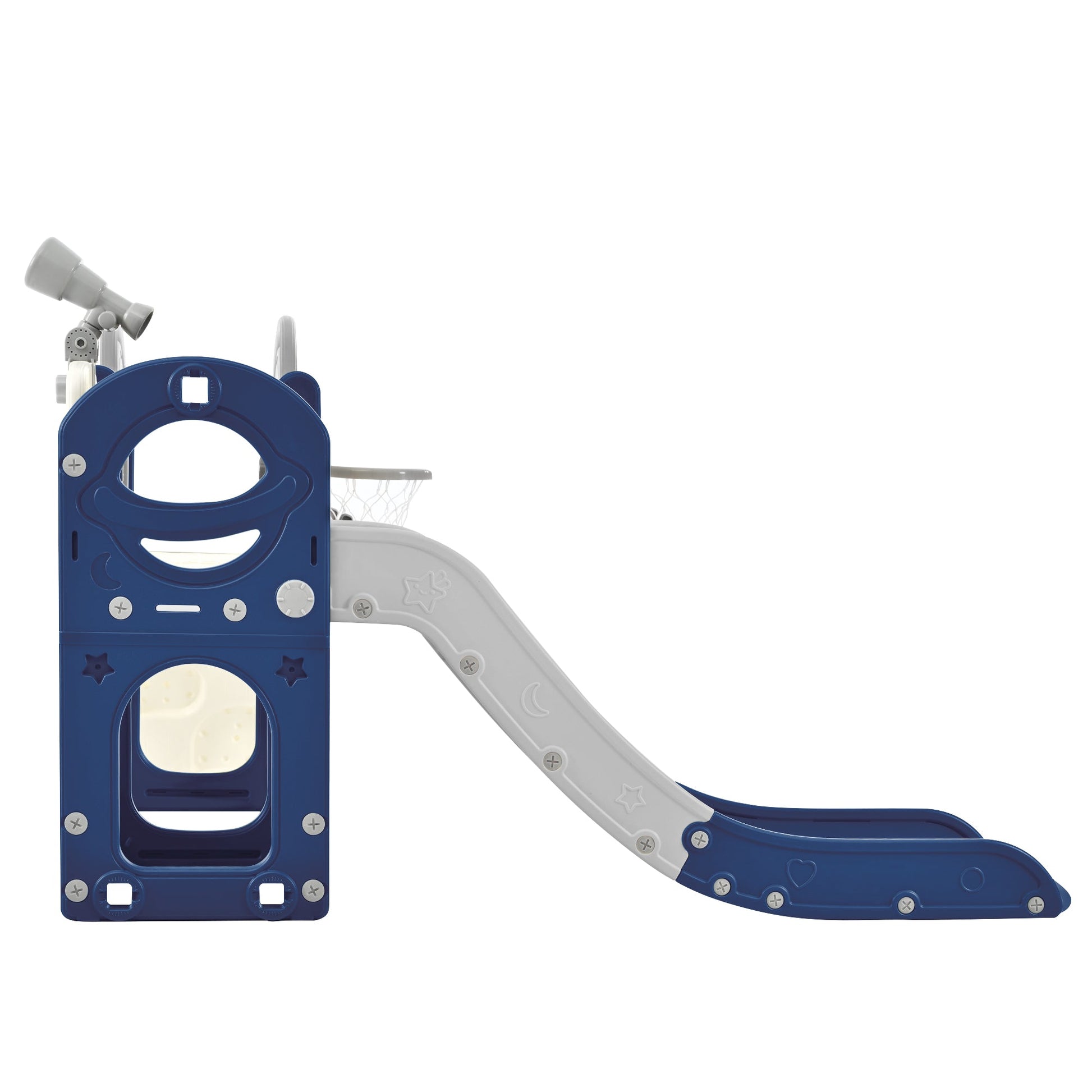 [Children's Playground 7-in1] Refreshing styling design! Delicate and cute freestanding slide set for toddlers with 7 functional parts: 1 slide, 1 basketball hoop, ring toss game, 1 telescope. 2 golf holes, 1 crawl-through tummeland 1 climber. This set allows children to completely release their playful nature, and they can play with their friends for hours!