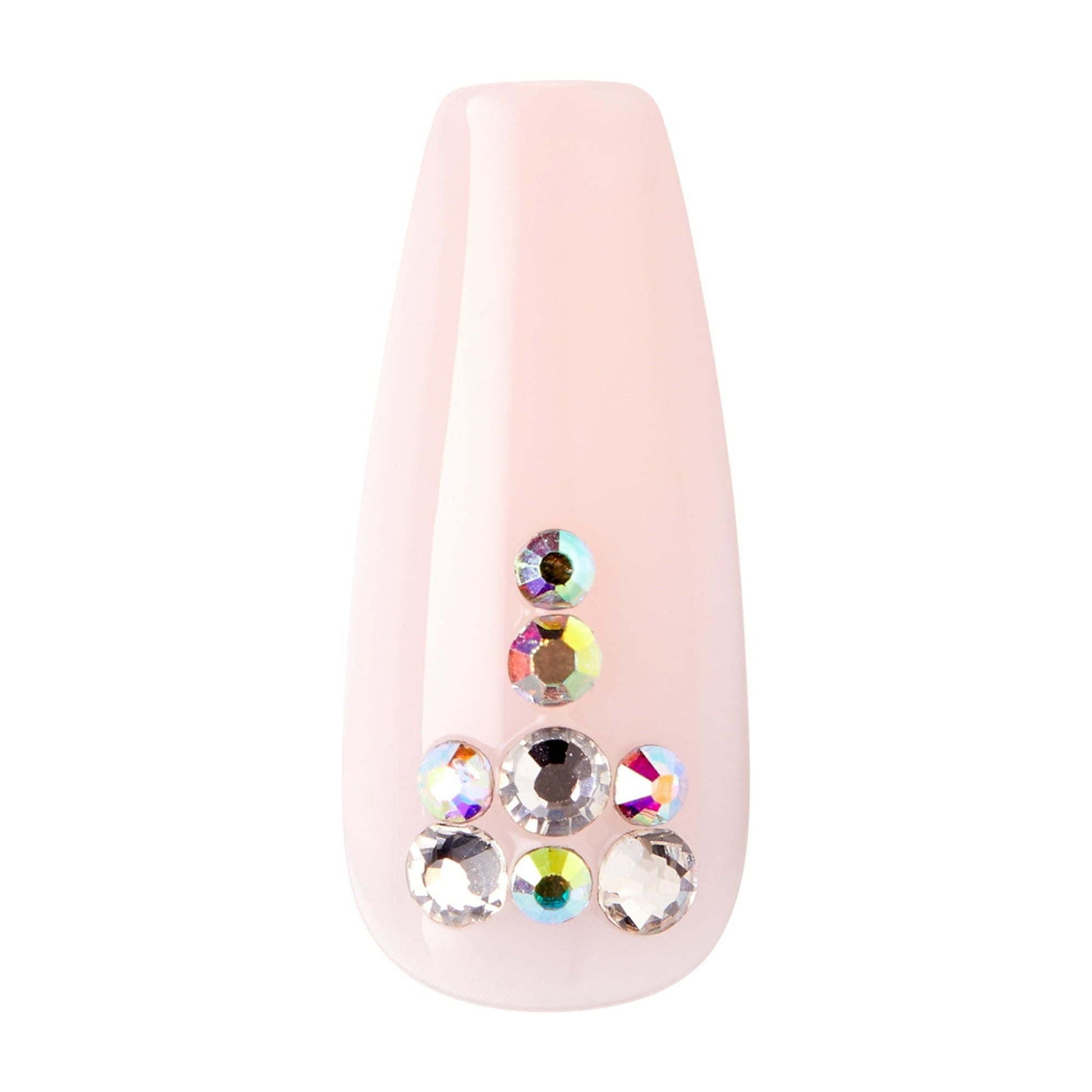 On trend fashion nails in pink are long length & coffin shaped with rhinestone accents Shape - Coffin Easy to apply & hassle free removal with up to 7-day wear Length - Long Durable, flexible, & comfortable