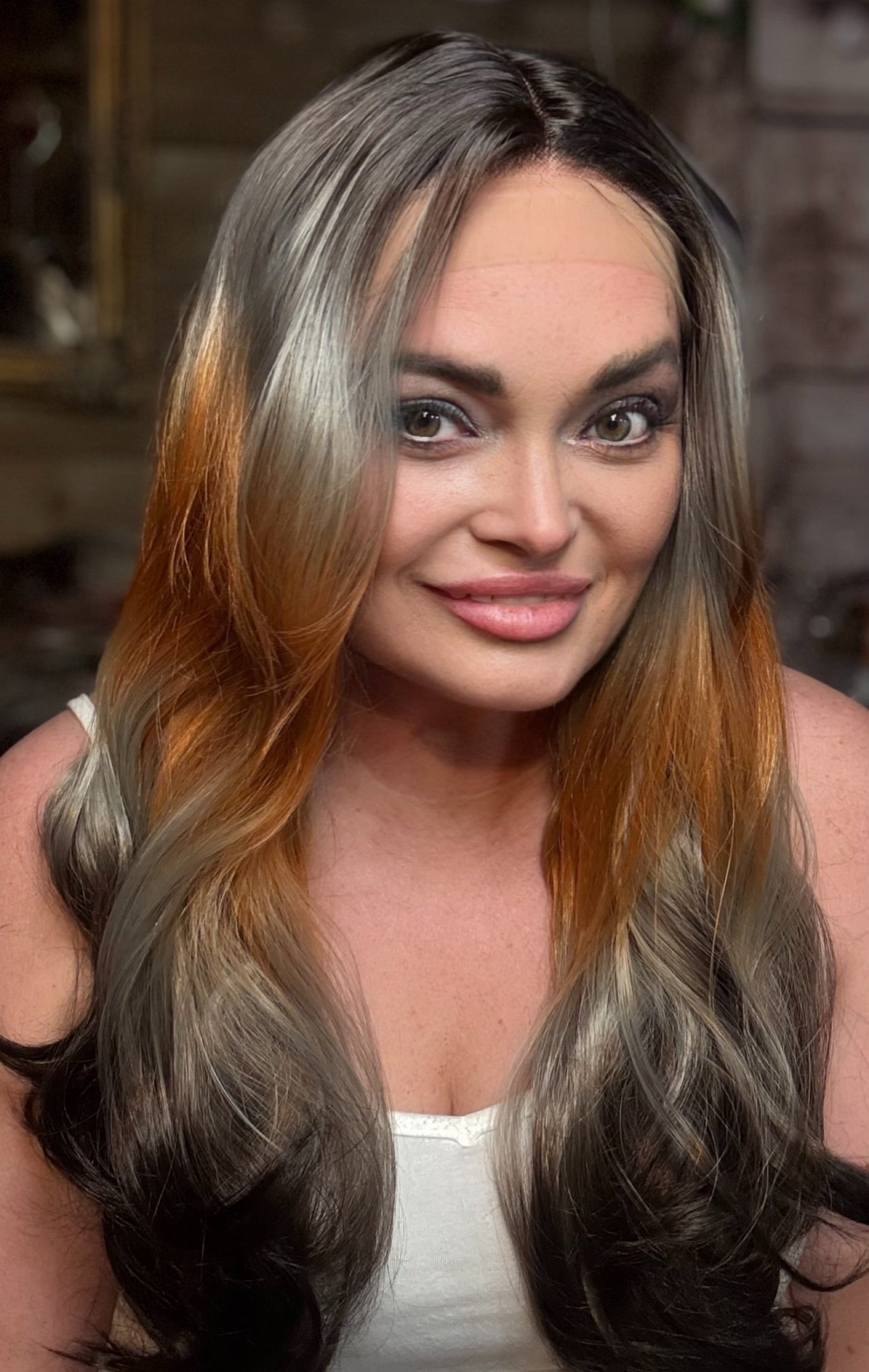 This 24" lace front T part wig features premium heat-resistant synthetic fiber styled in loose curls. Its striking silver, orange, and black ombre design offers a vivid, dynamic look. The standard cap size includes adjustable straps for a secure and comfortable fit, combining both style and practicality in one expertly crafted piece.