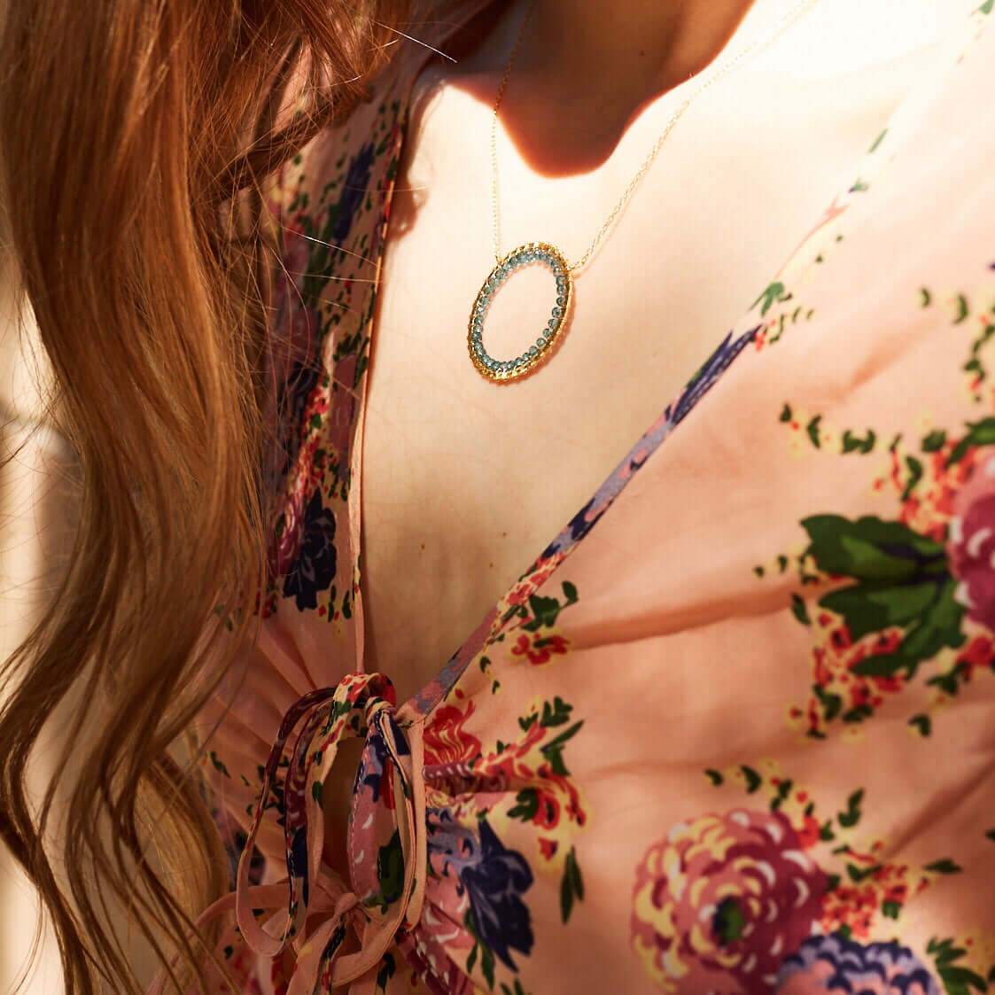 The Halo collection was our very first one. Intended to symbolize the intricate, universal energy woven within us all. This beautiful set is ultra lightweight and perfectly handmade featuring sparkling London Blue Quartz gems woven into our unique floating pendant design and paired with matching earrings.