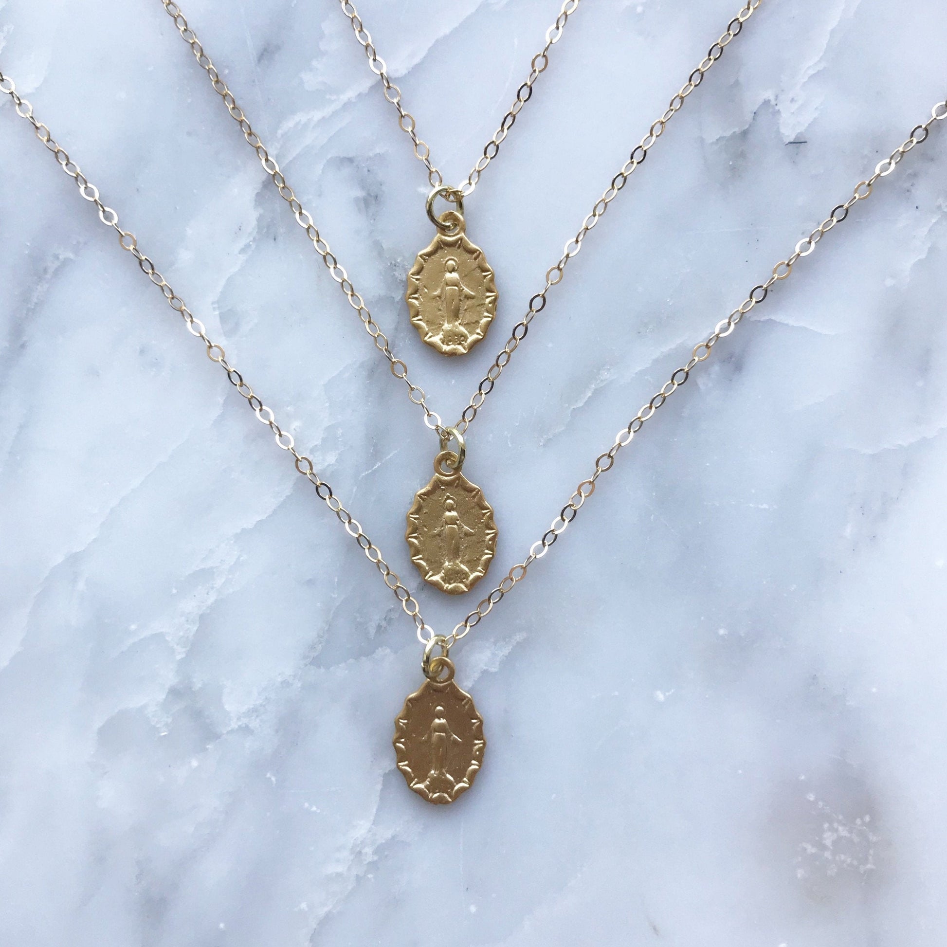 Our Miraculous Medal is a beautiful and meaningful piece. It features the classic depiction of the Virgin Mary on the front and the letter M on the back, symbolizing "Mary" or "Mediatrix." Made of high-quality Bronze and plated with gold, this vintage-inspired medal comes with a gold-filled chain that adds a touch of sophistication. This medal serves as a stylish accessory and a symbol of faith and devotion to the Virgin Mary.