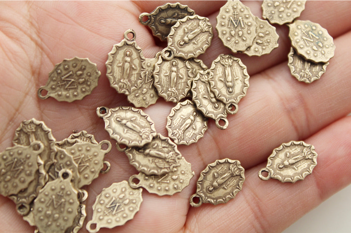 Our Bronze Miraculous Medal is a beautiful and meaningful piece. It features the classic depiction of the Virgin Mary on the front and the letter M on the back, symbolizing "Mary" or "Mediatrix." Made of high-quality Bronze, this vintage-inspired medal comes with a gold-filled chain that adds a touch of sophistication. This medal serves as a stylish accessory and a symbol of faith and devotion to the Virgin Mary.
