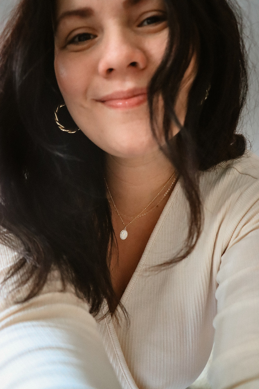 Our 18K Gold Filled Little White Mary necklace is a stunning and meaningful way to express your faith. This necklace features a small Mary medal adorned with shimmering Diamond CZs delicately wrapped around it. The front of the medal is accented with beautiful white enamel, representing the purity and grace of Mary.