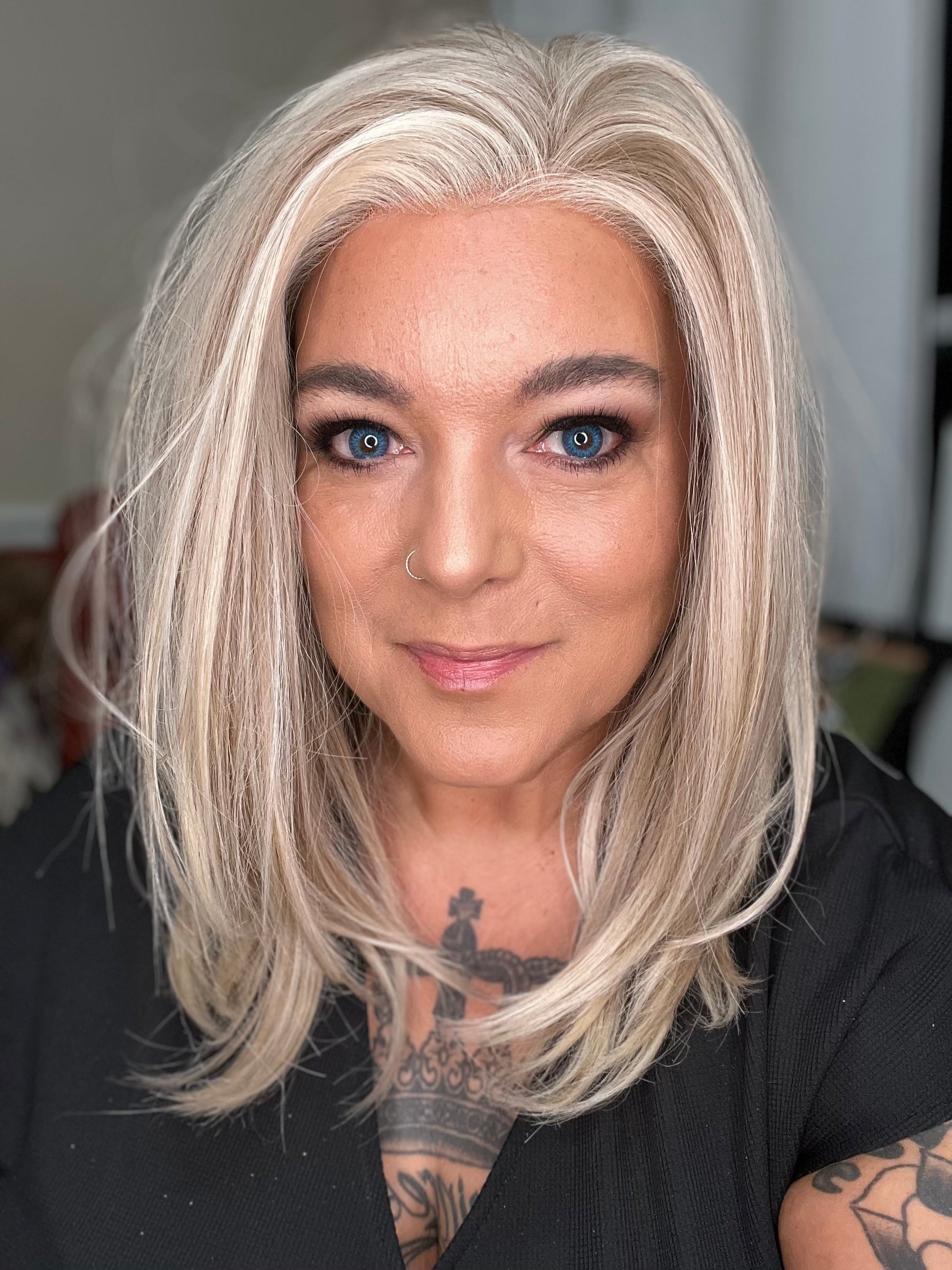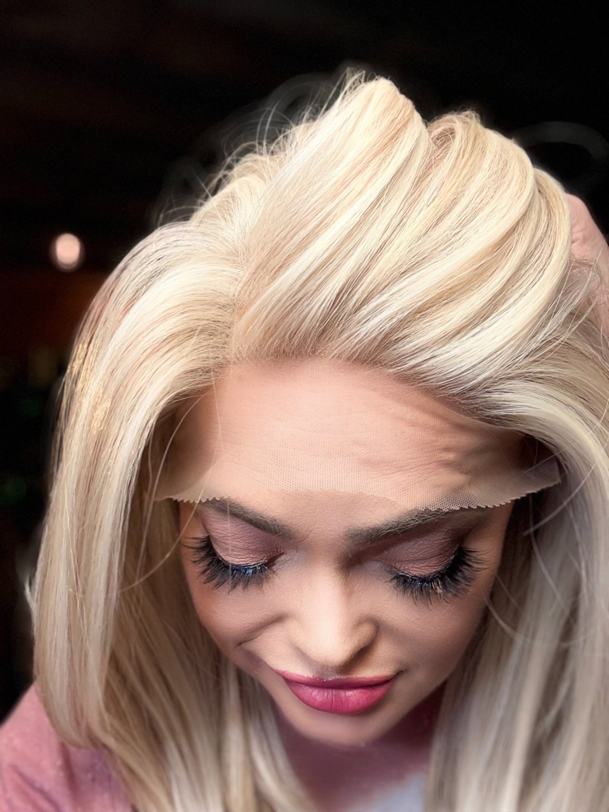 Introducing NIKKI, the premium heat resistant synthetic fiber lace front wig with a stunning asymmetrical 16 inch straight bob in a neutral warm blonde with cool tones. With an adjustable cap size and free part design, achieve a natural look and comfortable fit in just 10 to 14 days.