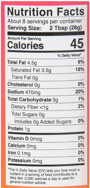 Nutrition Facts: Servings per container: 8 Size: 2 TBSP (28g), Amount/serving: Calories 45, Total Fat 4.5g (8% DV), Sat. Fat 3.5g (18% DV), Trans Fat 0g, Cholest. 0mg (0% DV), Sodium 470mg (20% DV), Total Carb. 3g (1% DV), Fiber <1g (2% DV), Total Sugars 0g (Incl. 0g Added Sugars, 0% DV), Protein 1g, Vit. D 0mcg (0% DV), Calcium 0mg (0% DV), Iron 0mg (0% DV), Potassium 0mg (0% DV).