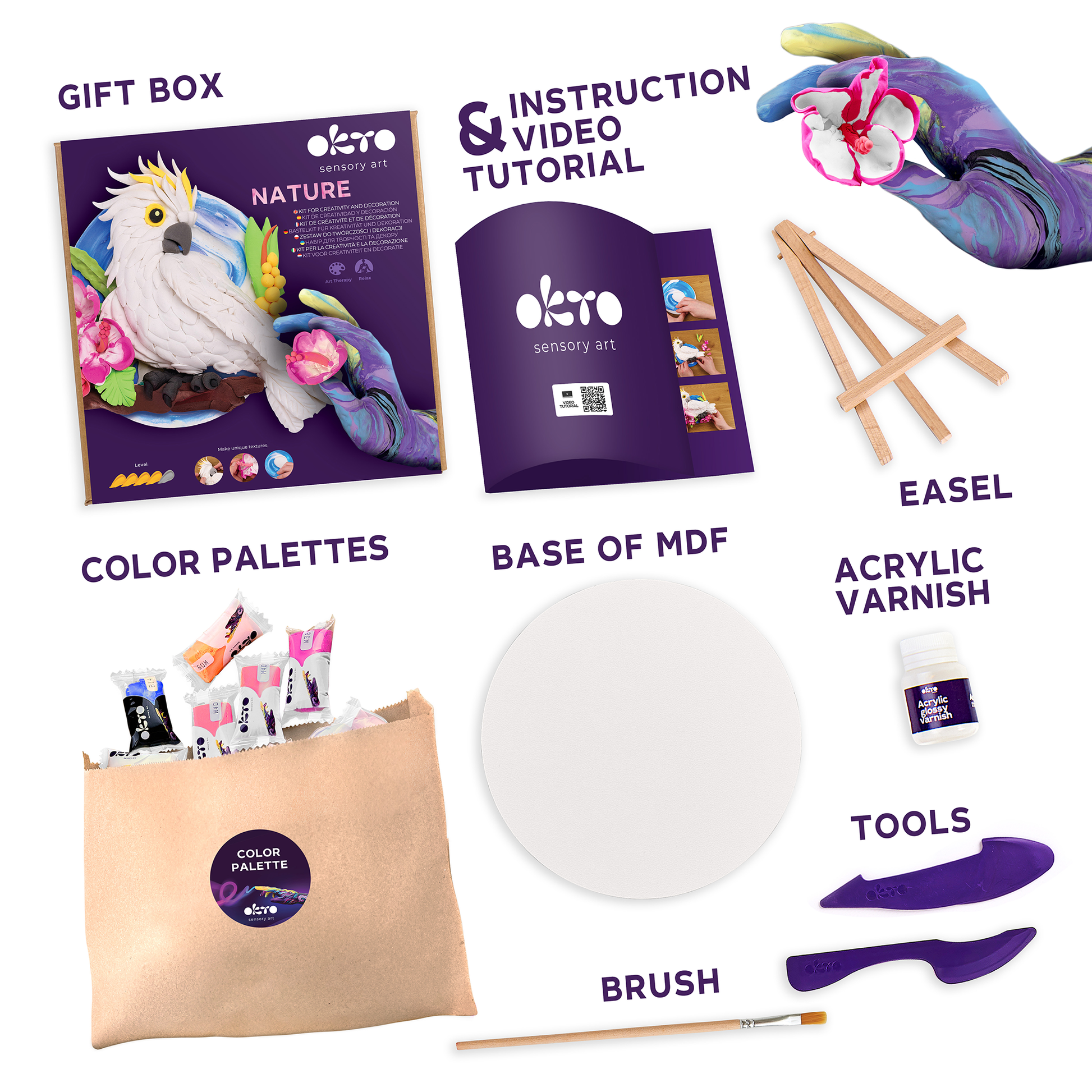 Sculpt a display‑worthy 3D artwork – 3D Cockatoo – with OKTO air‑dry clay. The pre‑printed textured board (29 x 29 cm / 11.4 x 11.4 in) shows where to build highlights and depth; seal with varnish for a lasting finish. Perfect for craft nights, decor, and gifting. No baking required. Recommended for ages 14+ (intermediate/advanced).