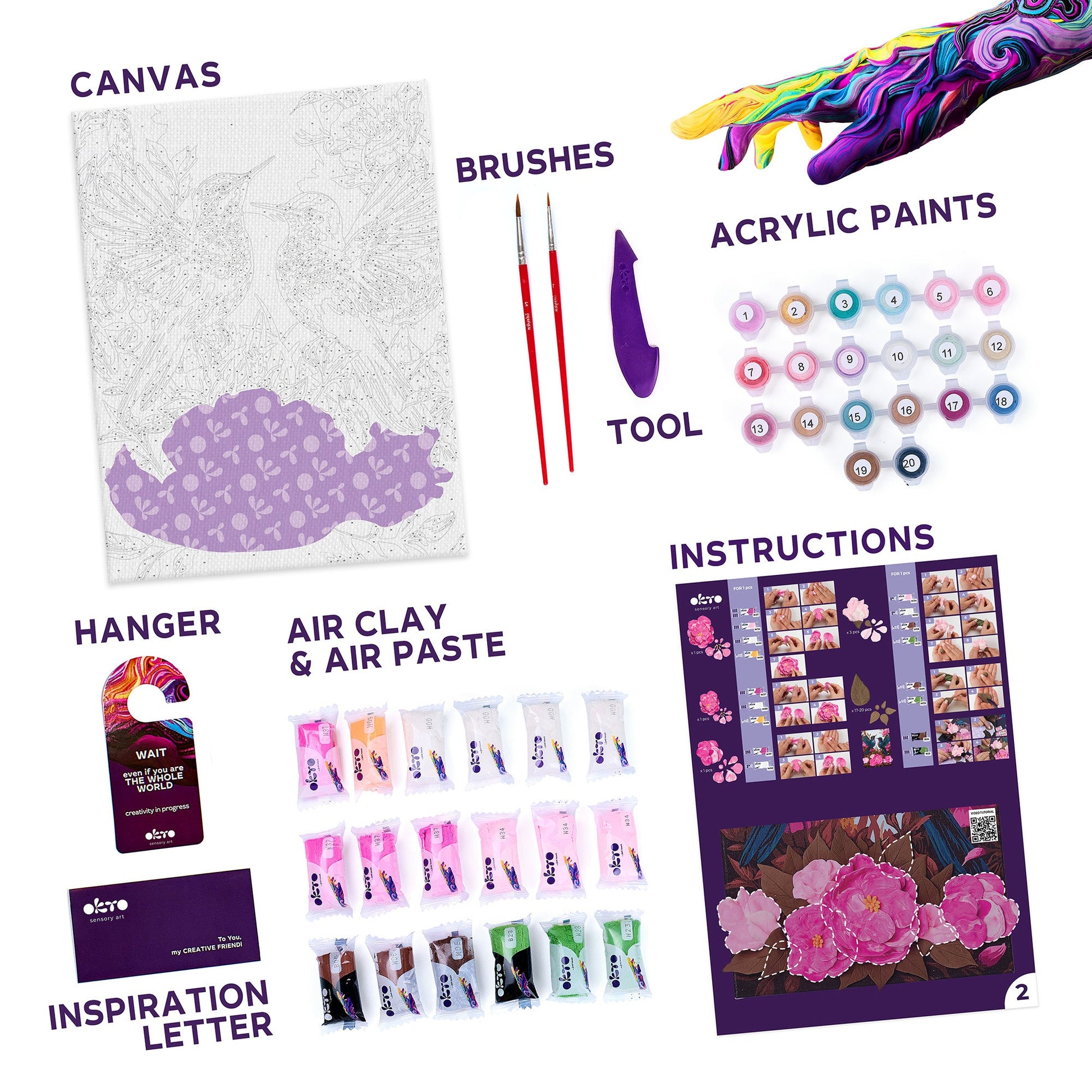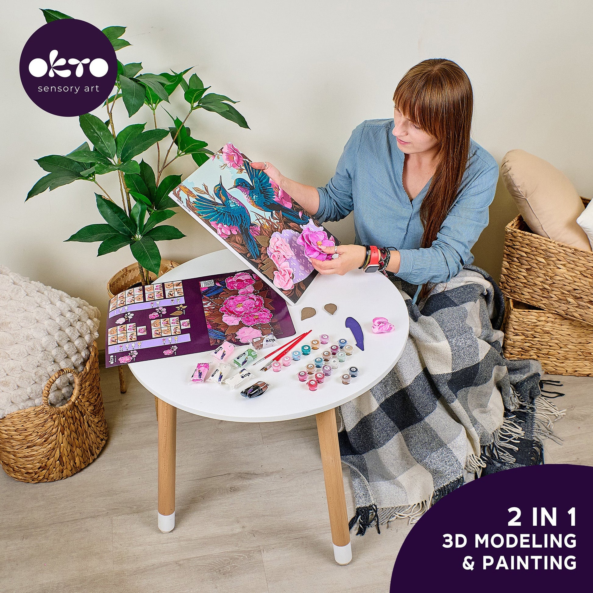 Sculpt a display‑worthy 3D artwork – Kit Hummingbirds – with OKTO air‑dry clay. The pre‑printed textured board (30 x 40 cm / 11.8 x 15.7 in) shows where to build highlights and depth; seal with varnish for a lasting finish. Perfect for craft nights, decor, and gifting. No baking required. Recommended for ages 14+ (intermediate/advanced).