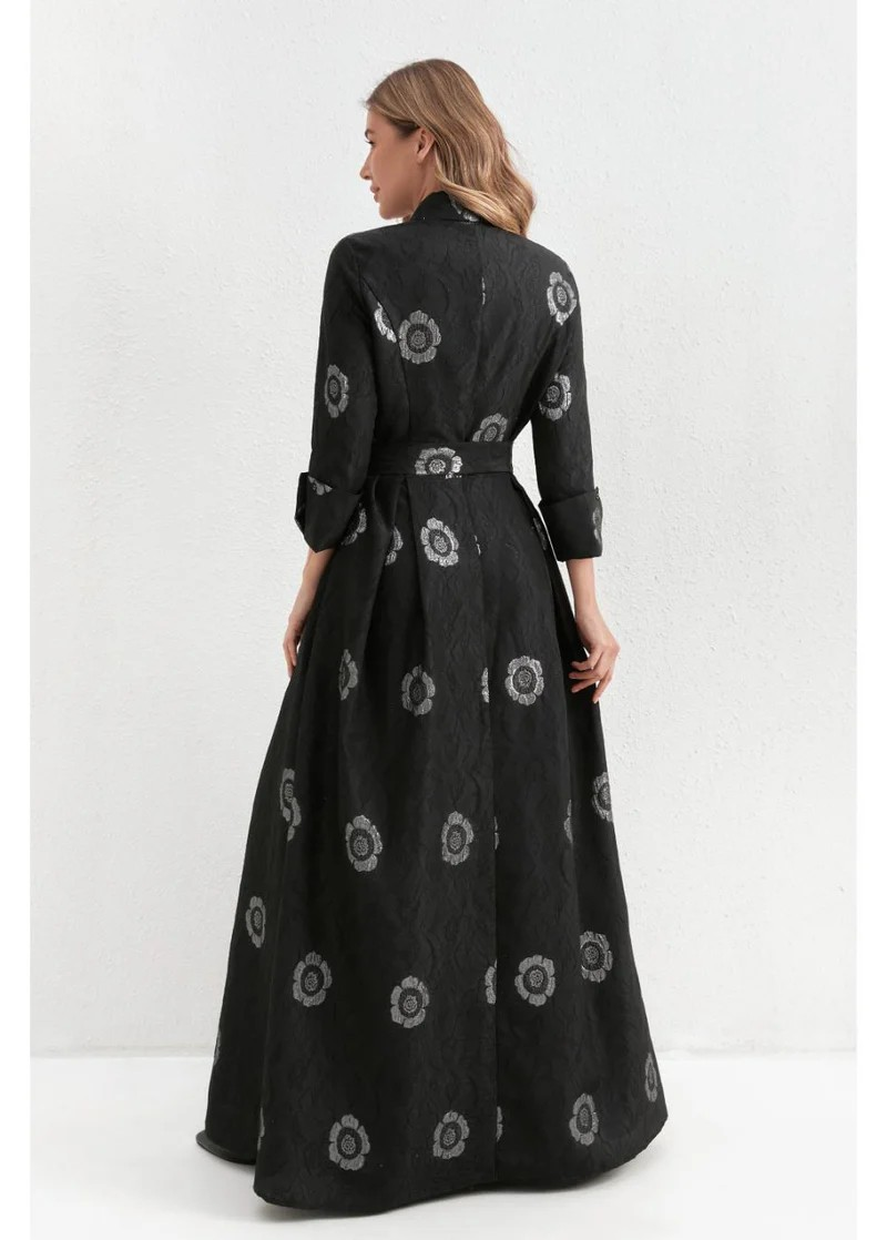 This stunning full-length maxi dress features a button-front, collar, tie belt, and chic 3/4 sleeves. Crafted from black jacquard adorned with sparkling silver floral medallions, it’s perfect for adding a touch of glam to your evening plans. With its modest long sleeves and elegant design, this dress is ready to shine at any party, dinner, or special occasion.