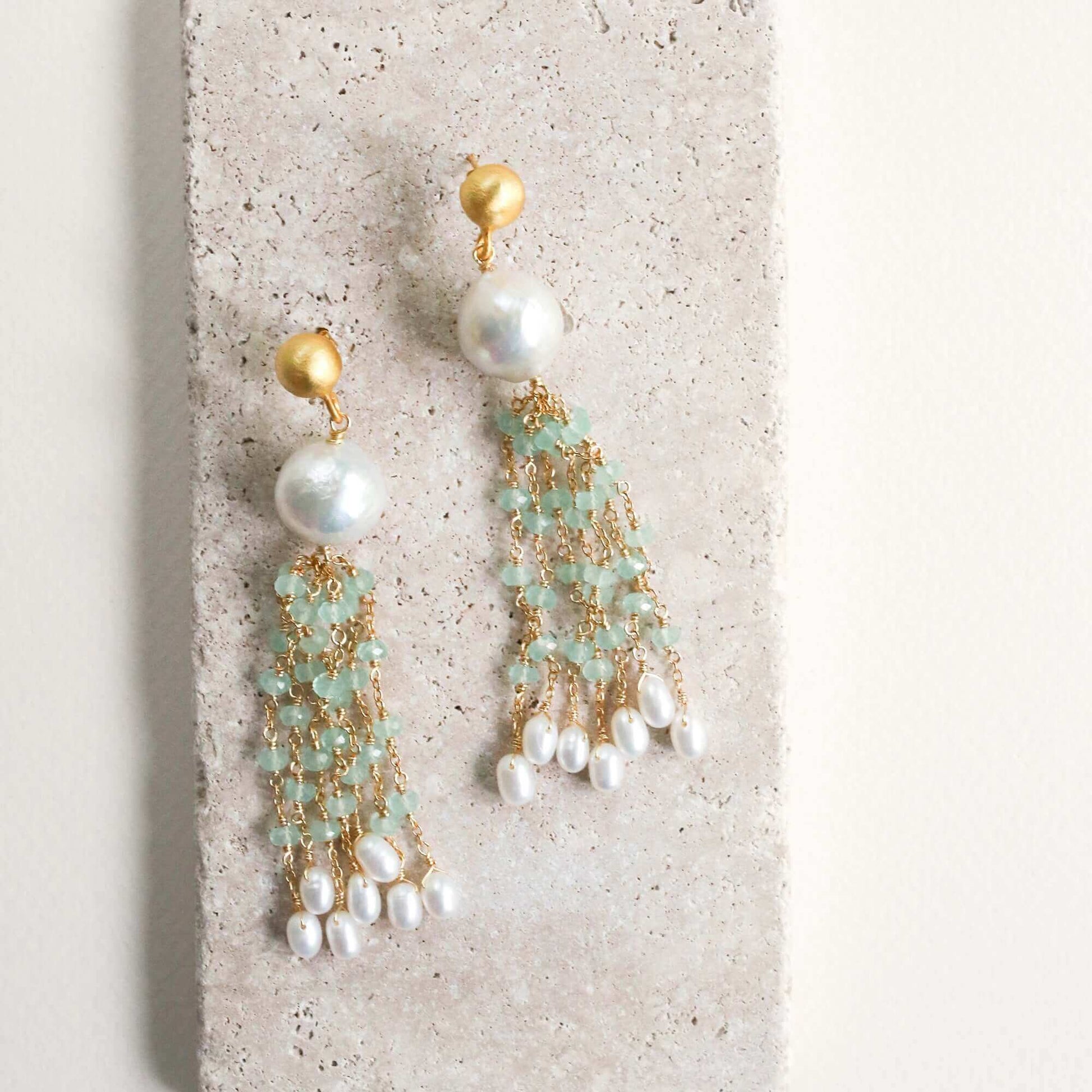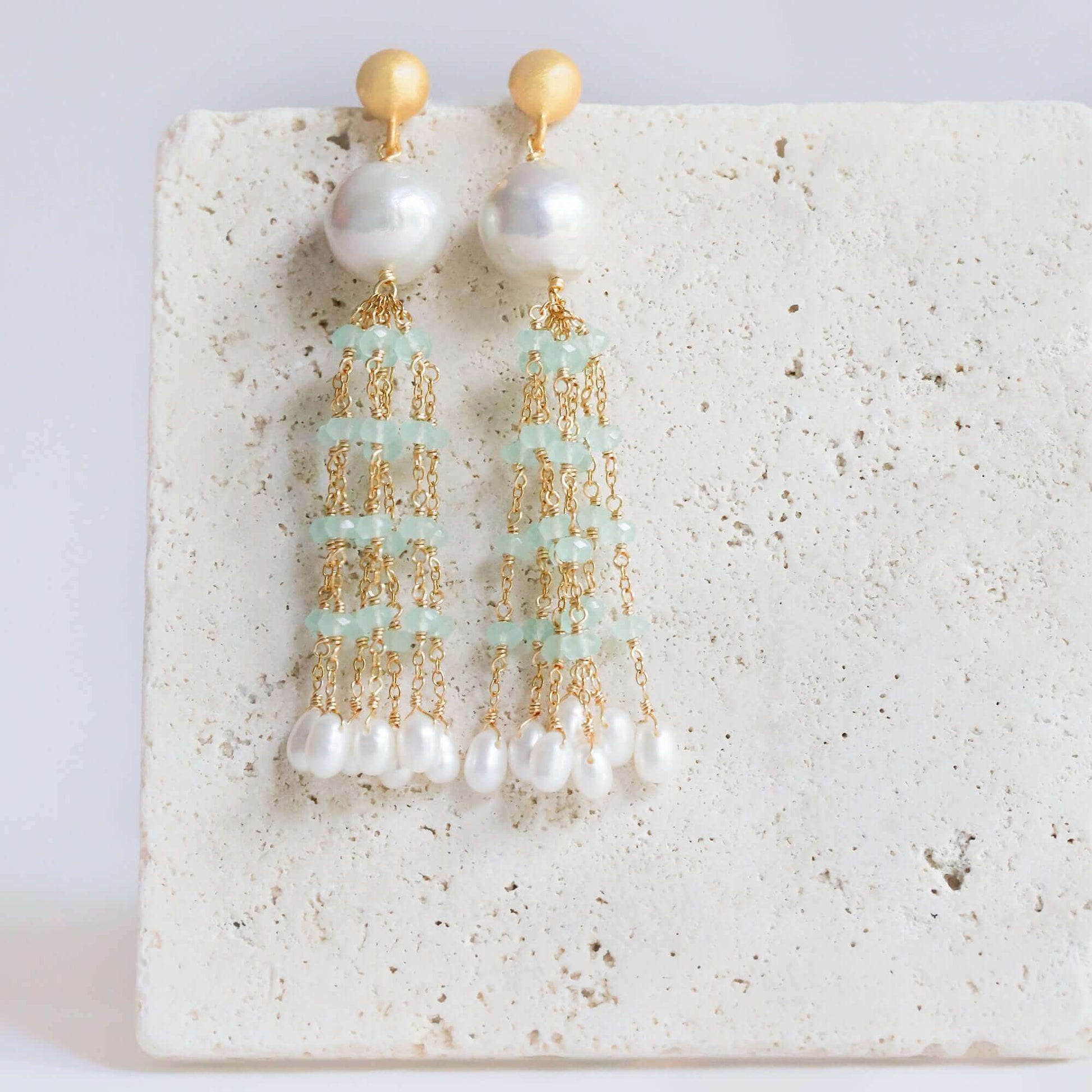 Pearl & Aqua Chalcedony Tassel Earrings