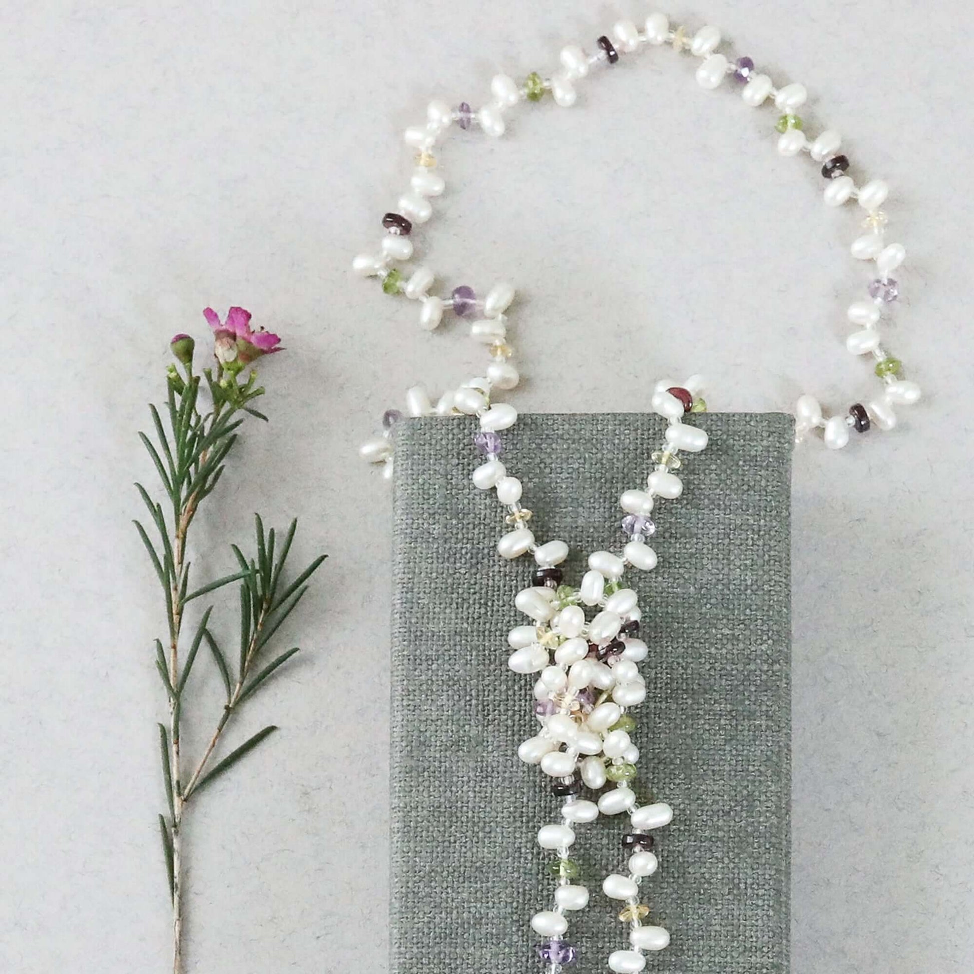 Our version of a modern lariat necklace makes a statement but is easy to wear with anything, including a white t- shirt. Can be tied and wrapped multiple ways. The shape of bead pearls will make it hold whatever shape you choose.