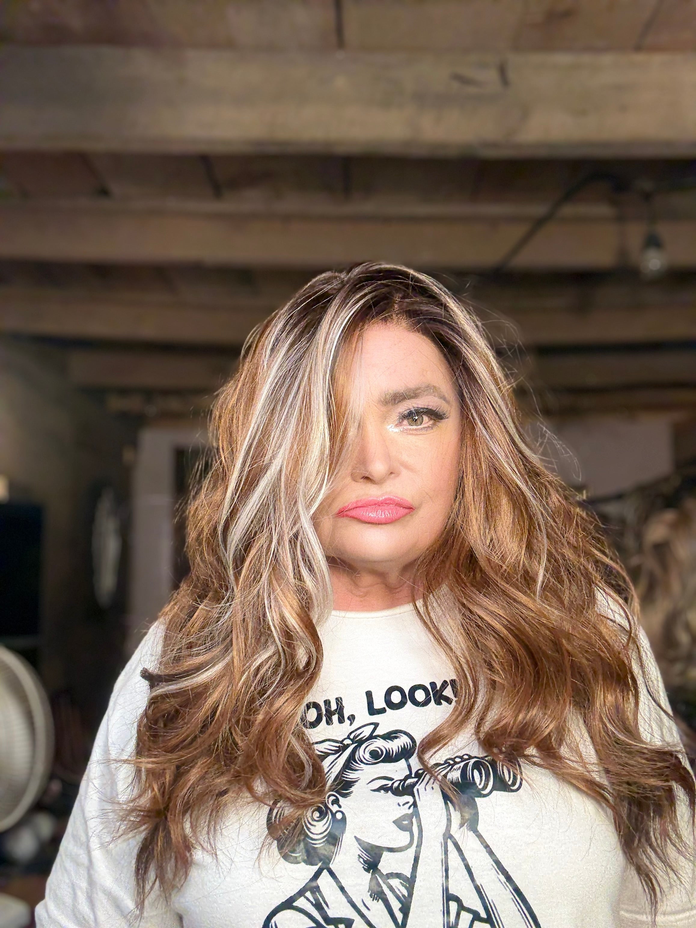Upgrade your style with PHOENIX, a stunning 24 inch lace front wig with loose curls and layered styling. Made from premium heat-resistant synthetic fiber, it features a customizable fit with adjustable straps and a standard cap. With a gorgeous mix of brown and copper blonde shades, this wig from Custom Martini Wigs will definitely turn heads.