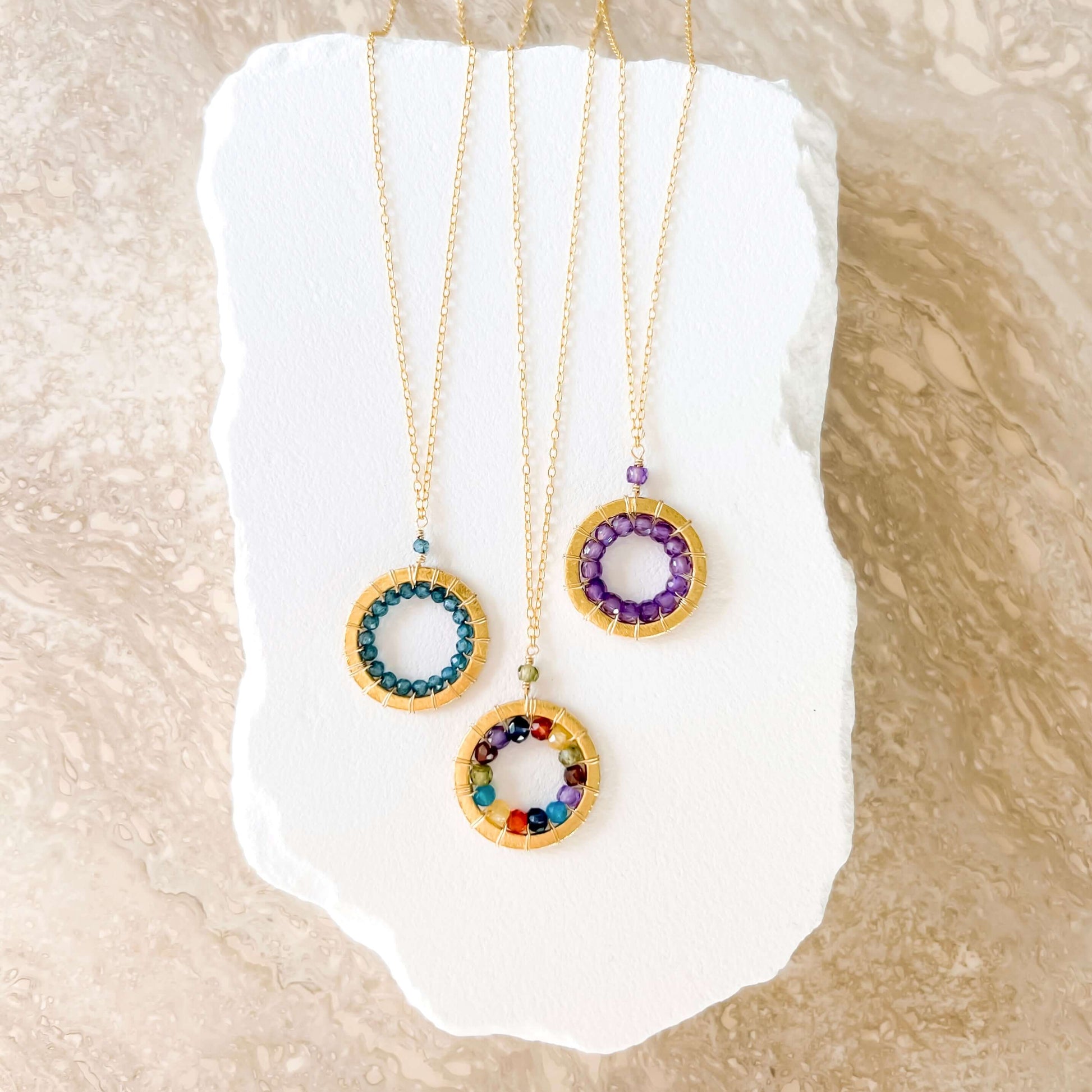 The Halo collection was our very first one. Intended to symbolize the intricate, universal energy woven within us all. This beautiful necklace is ultra lightweight and perfectly handmade featuring a sparkling rainbow of gems woven into our unique, mini floating pendant design.