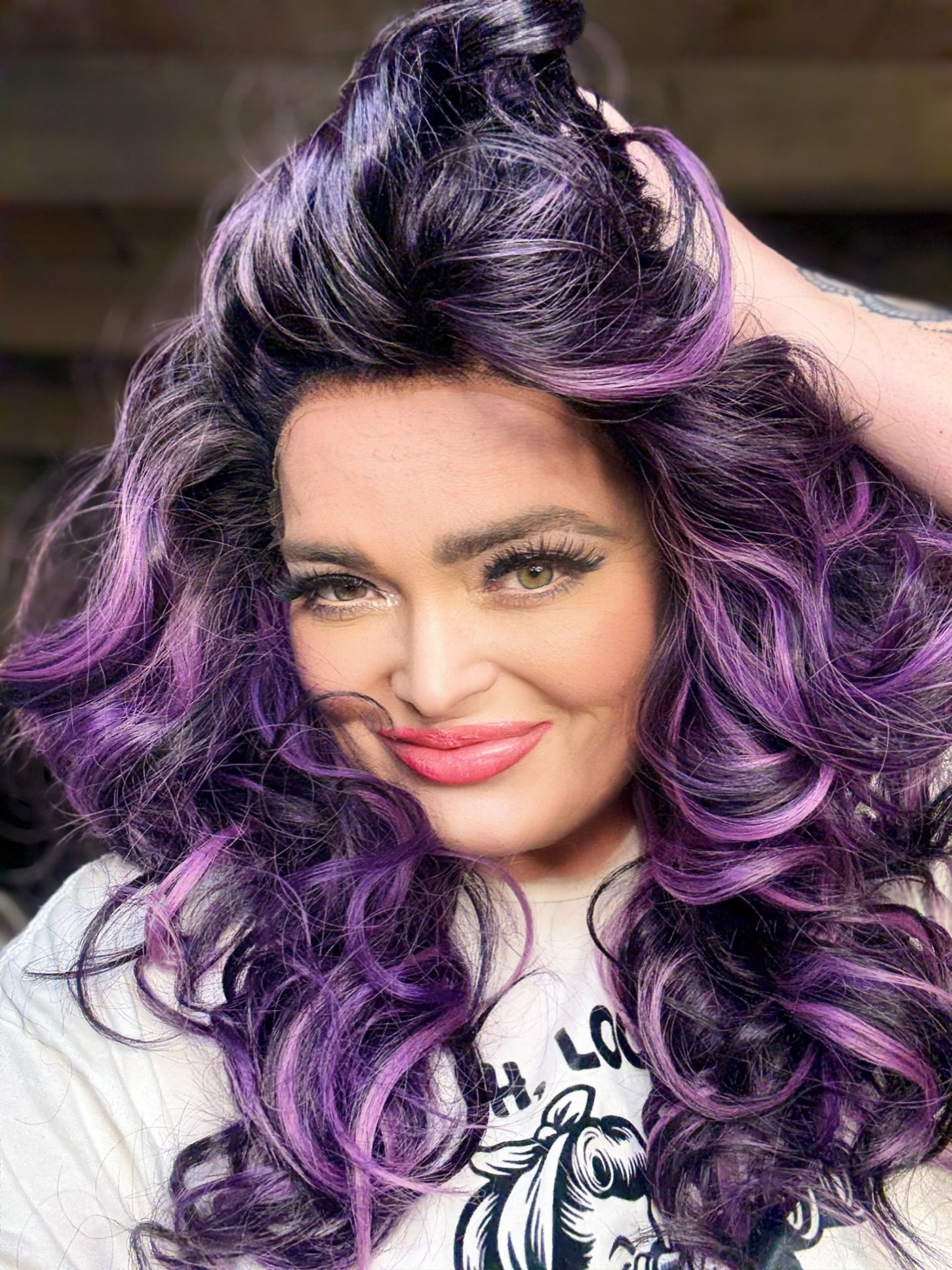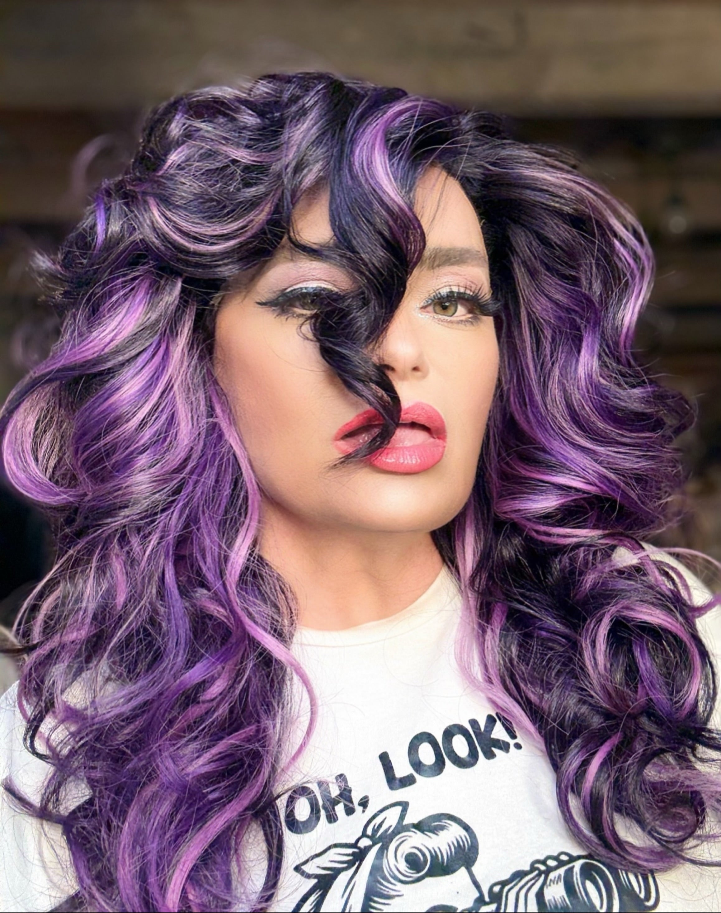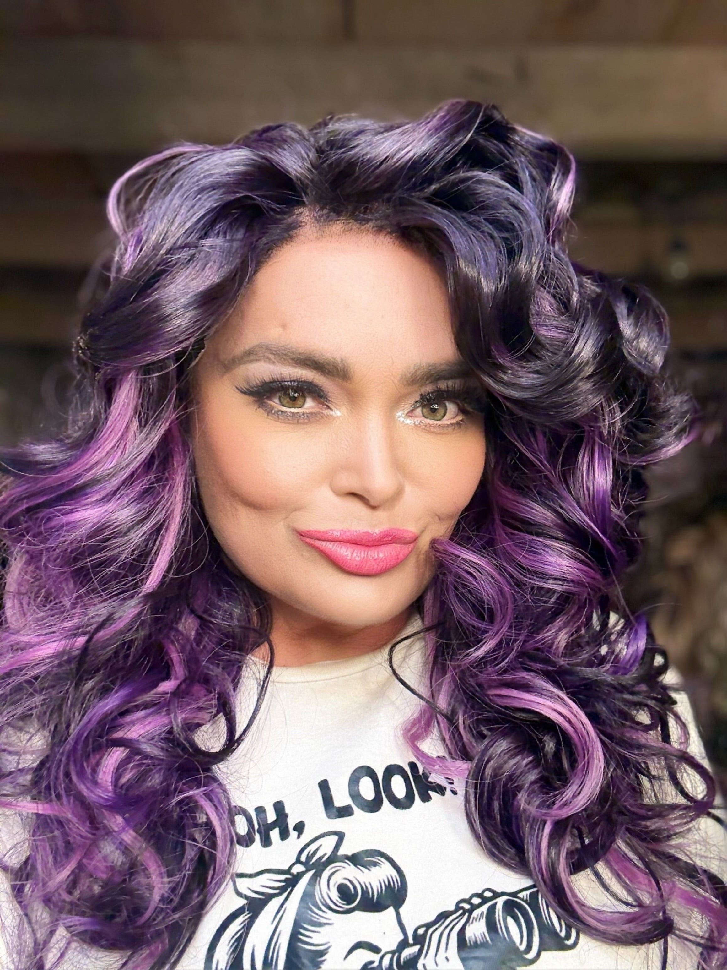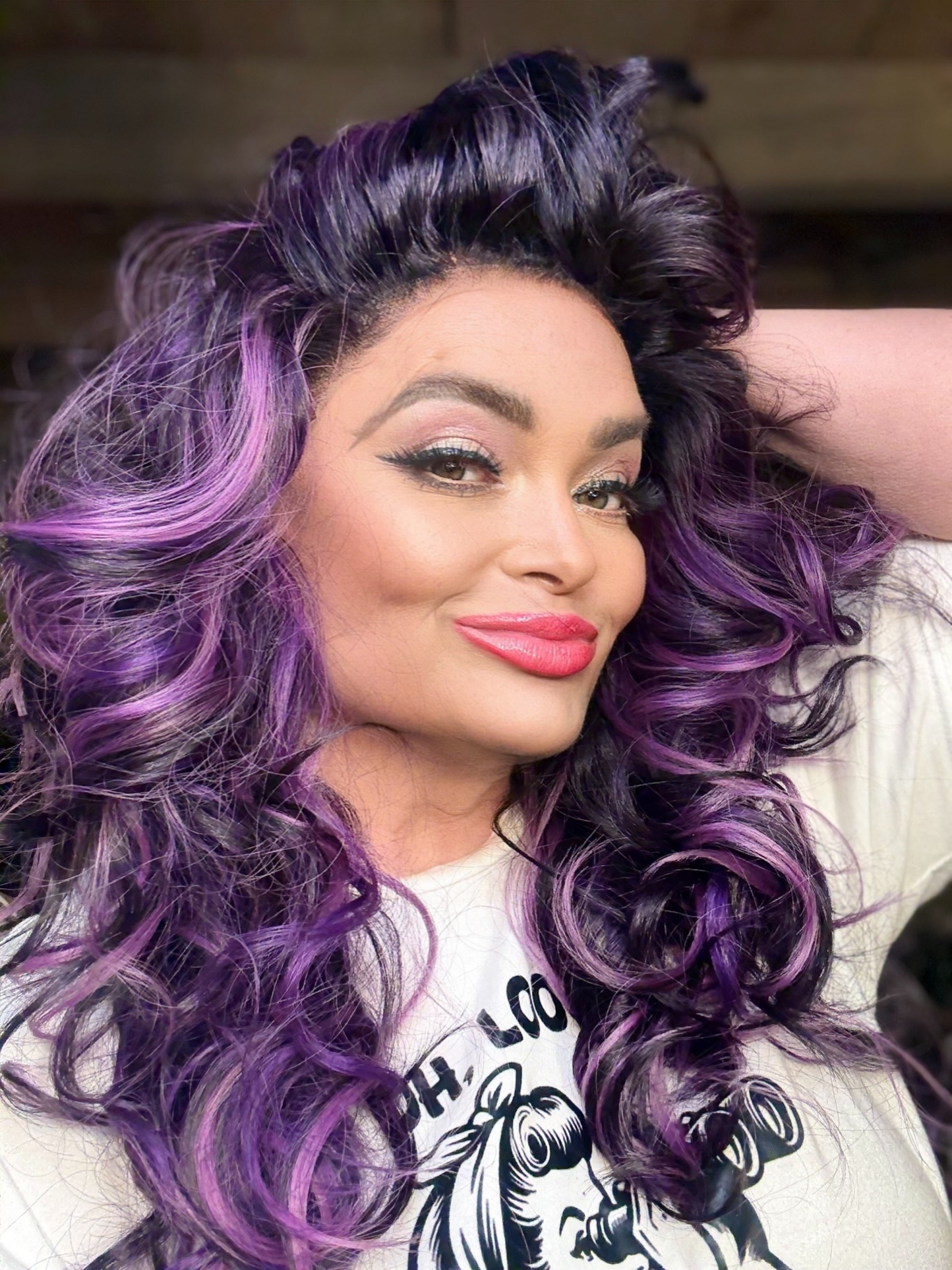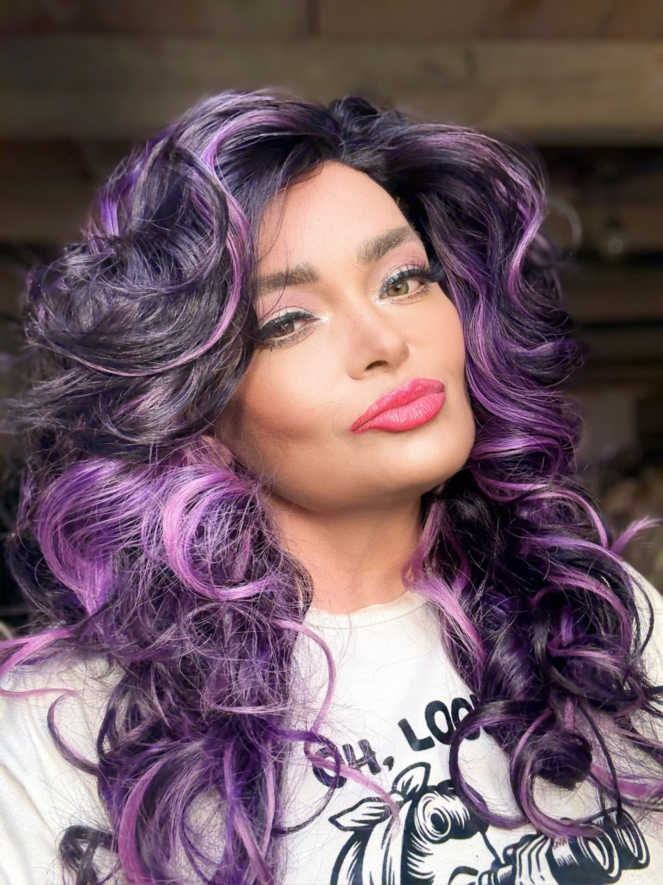 Introducing RAYNA, a stunning lace front wig with big, bouncy curls and soft black hair with purple highlights. Made with premium heat resistant synthetic fiber, this wig features a free part and adjustable straps for a comfortable fit. Perfect for adding volume and style to any look.