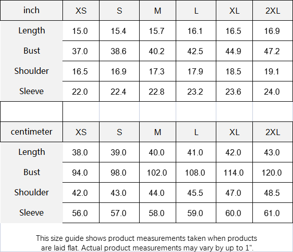 This size guide shows product measurements taken when products are laid flat. Actual product measurements may vary by up to 1".