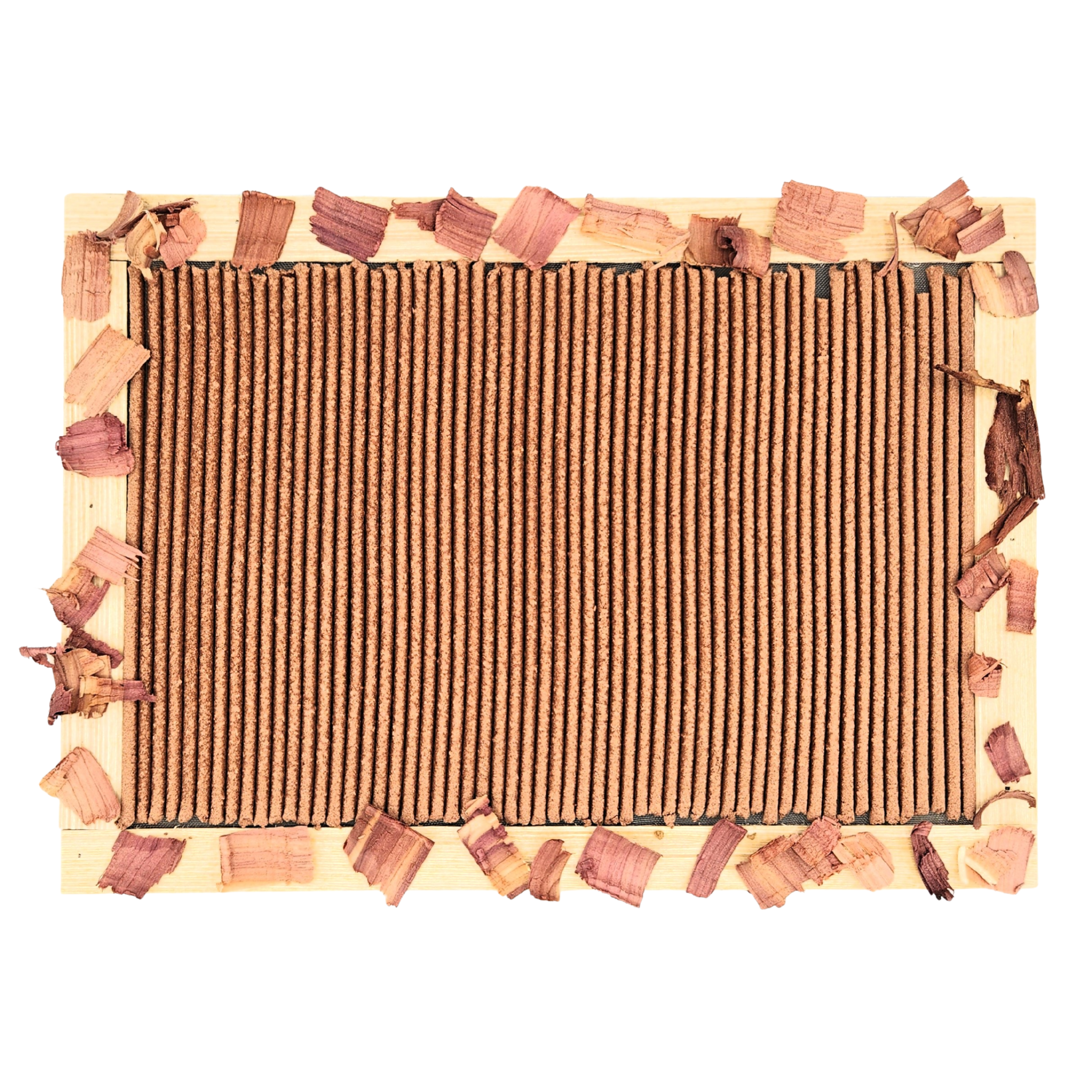 Amish Red Cedar Shavings, Traditional Japanese Makko Bark, Pine Sap, and Organic Guar Bean Gum.