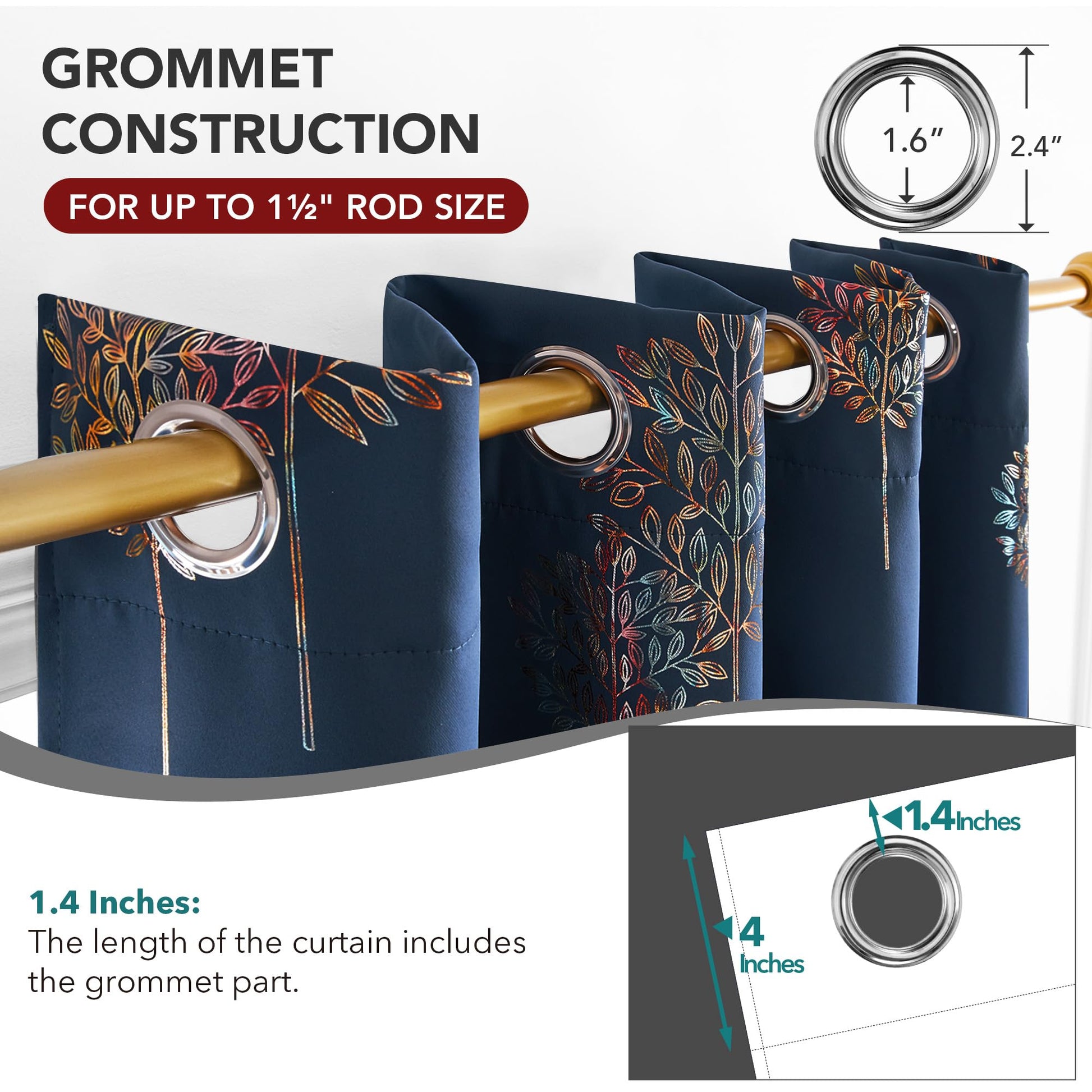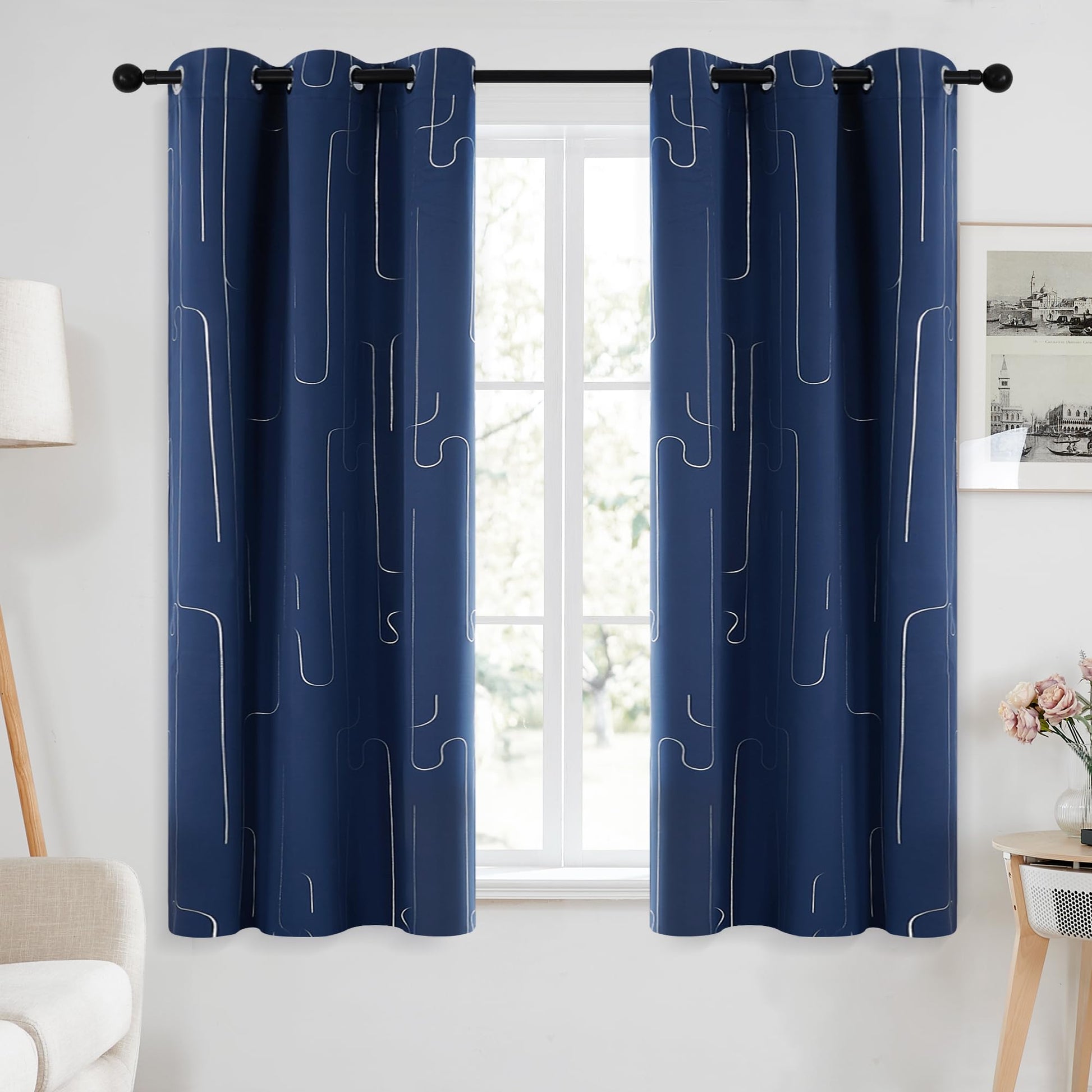 Room Darkening Curtains with Line Foil Print, Navy Blue, 2 Panels