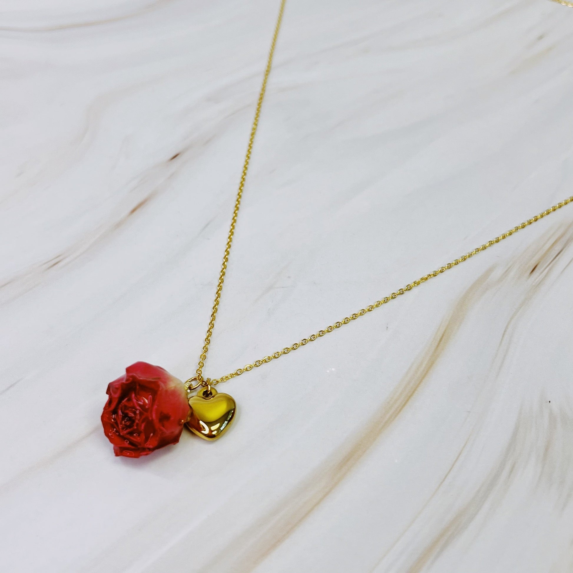 This necklace features a coated real rose bud pendant with golden heart charm, making it a truly one-of-a-kind piece. Add a touch of elegance and beauty to any outfit with this stunning necklace.