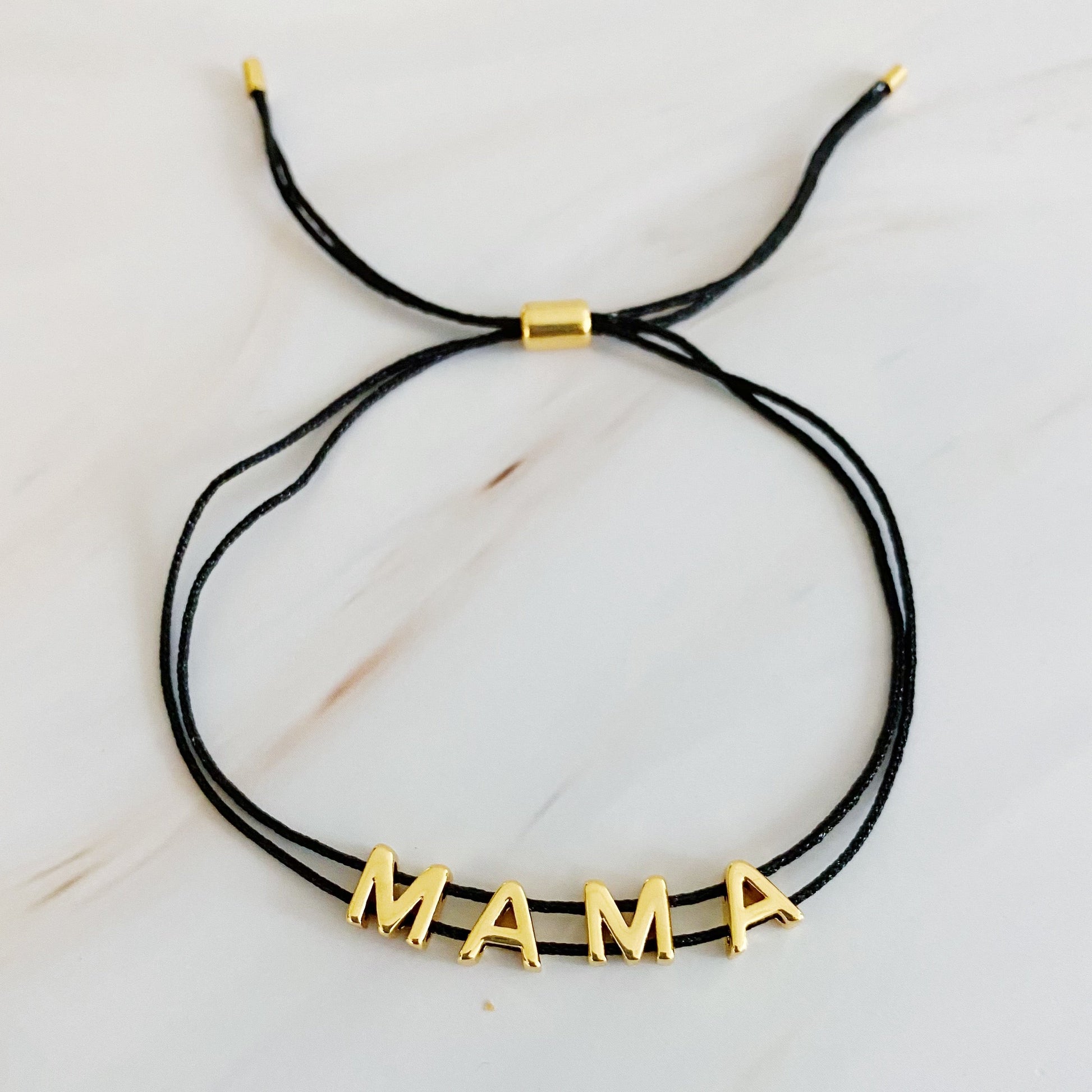 This beautiful MAMA bracelet is made of a slim satin thread with simple golden font MAMA. Its clean, minimalist design features adjustable drawstring size for easy fitting, with each letter that moves independently around the thread. Perfect for the fashionable, yet understated, mother.