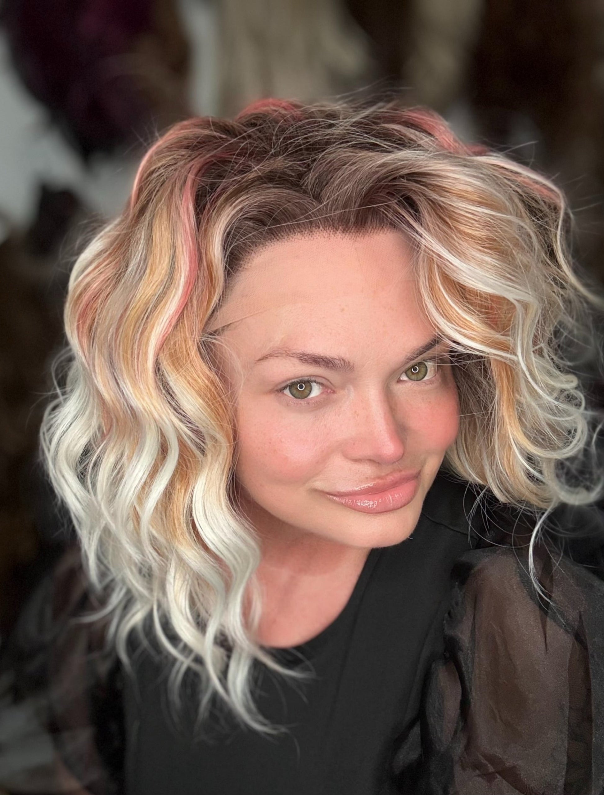 Discover the effortless beauty of the SAVANNAH Dusty Rose wig. Featuring a 13 x 4 lace front with a free part, this premium heat resistant synthetic fiber wig boasts stunning blonde highlights with a touch of blush for a soft, natural look. The 14 inch loose curls with layers provide great lift and volume while the rooted design and adjustable straps ensure a comfortable fit. Pre-order yours today!