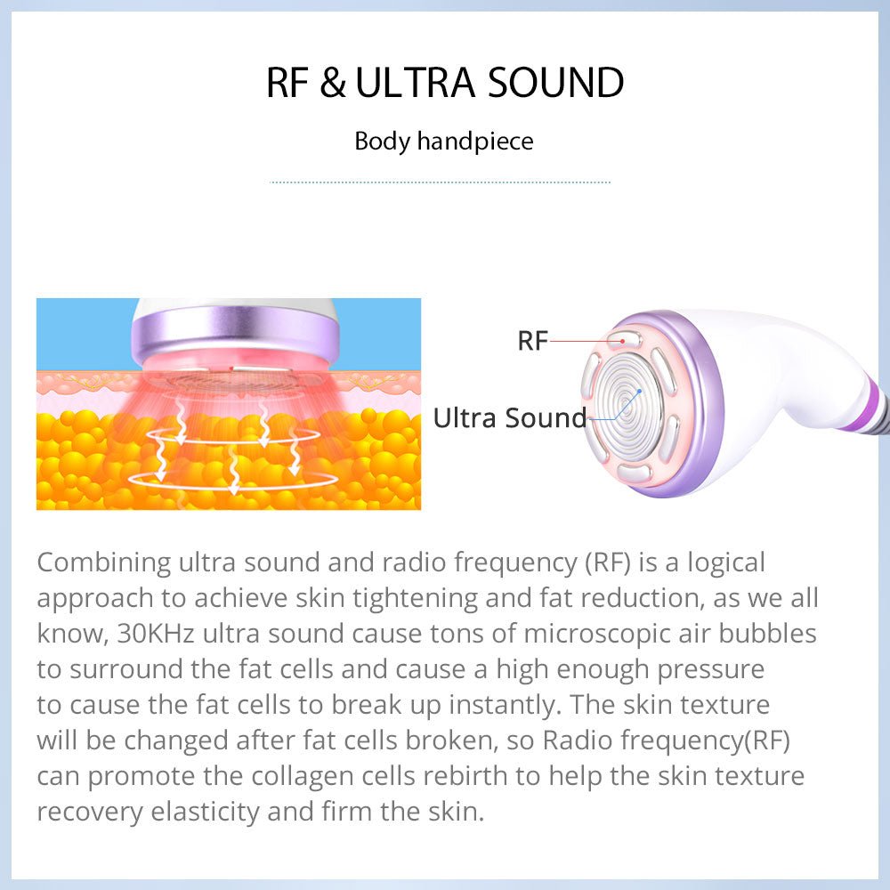 Important Usage Note: The RF pins surrounding the handle are positively charged, while the cavitation at the center is negatively charged. When gel is applied, the charges interact to generate heat. For the 30K cavitation + RF handles, massage oil is recommended instead of gel. If gel is used, ensure continuous movement of the handle during application.