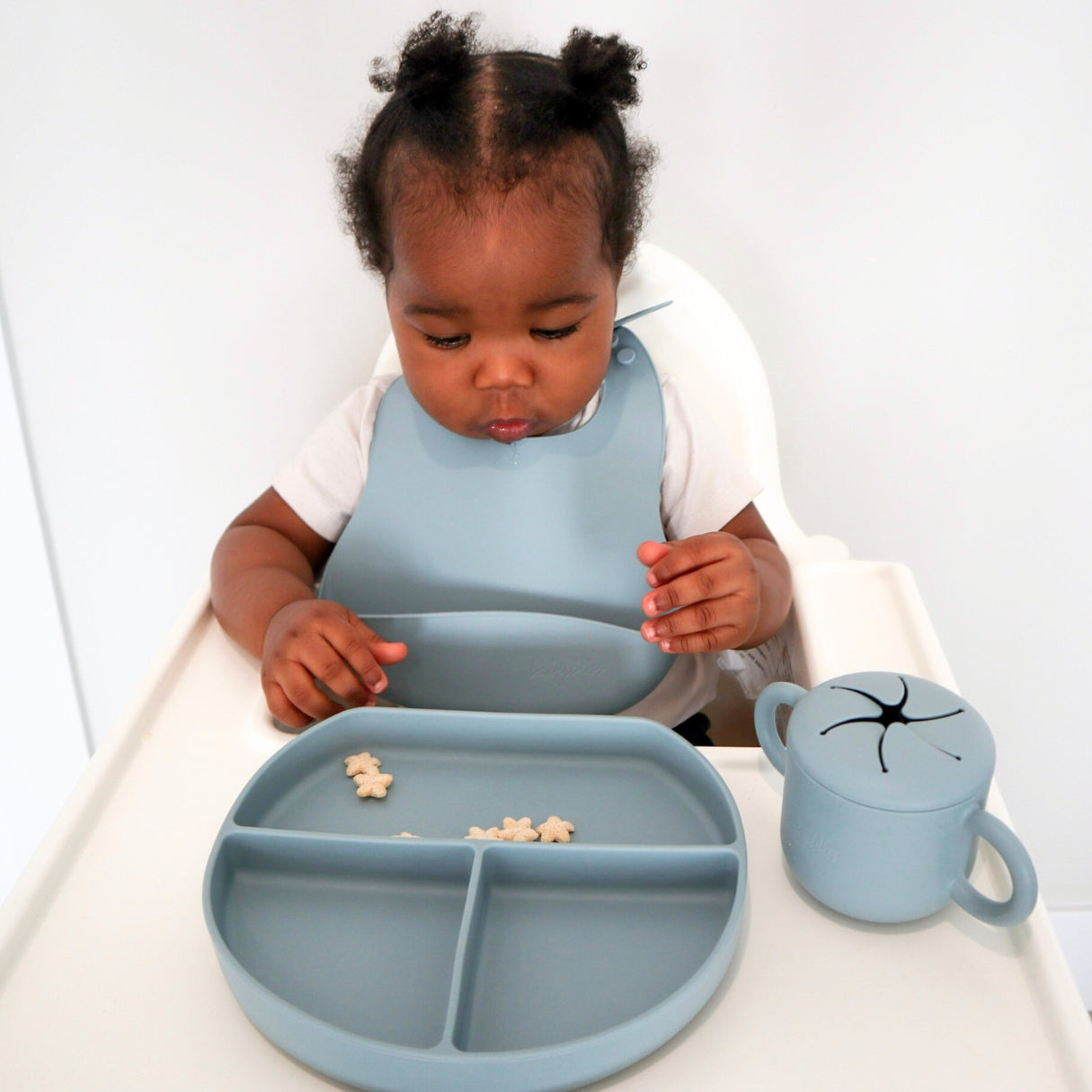 Designed in Canada, this silicone suction plate features a strong suction base and three large divided sections to promote independent eating. Uniquely designed to fit along most highchairs for an easy feeding experience. This feeding set is a great choice for both baby-led weaning and experienced toddlers.