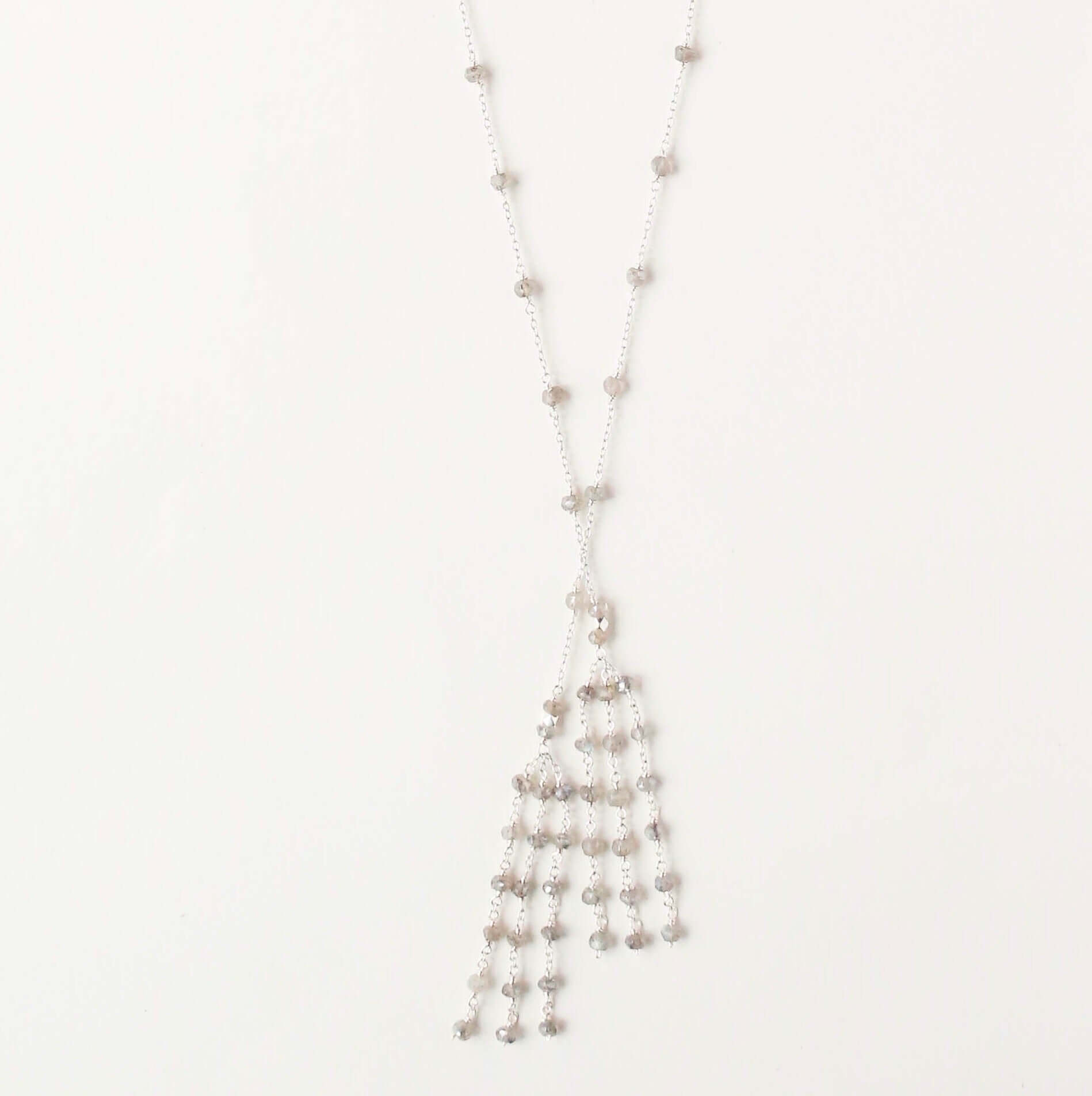 Delicate lariat necklace made with labradorite gemstones and finished off with a beautiful tassel design. Designed as a shorter lariat so it falls mid-chest. We love to plate our silver jewelry with Rhodium so it won't tarnish and has a shine like white gold.