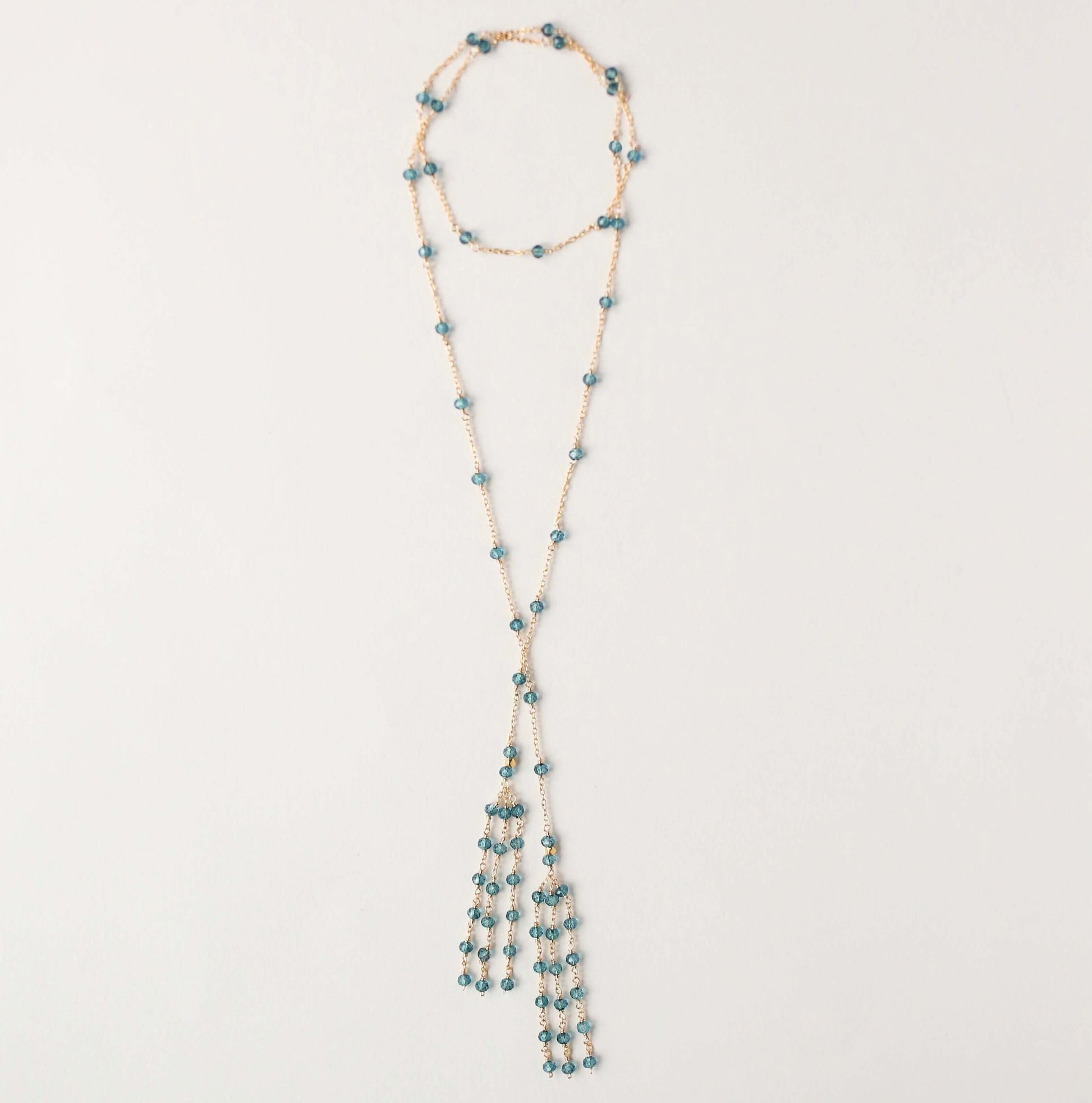 Delicate lariat necklace made with london blue quartz gemstones and finished off with a beautiful tassel design. Designed as a shorter lariat so it falls mid-chest. We love to plate our silver jewelry with Rhodium so it won't tarnish and has a shine like white gold.