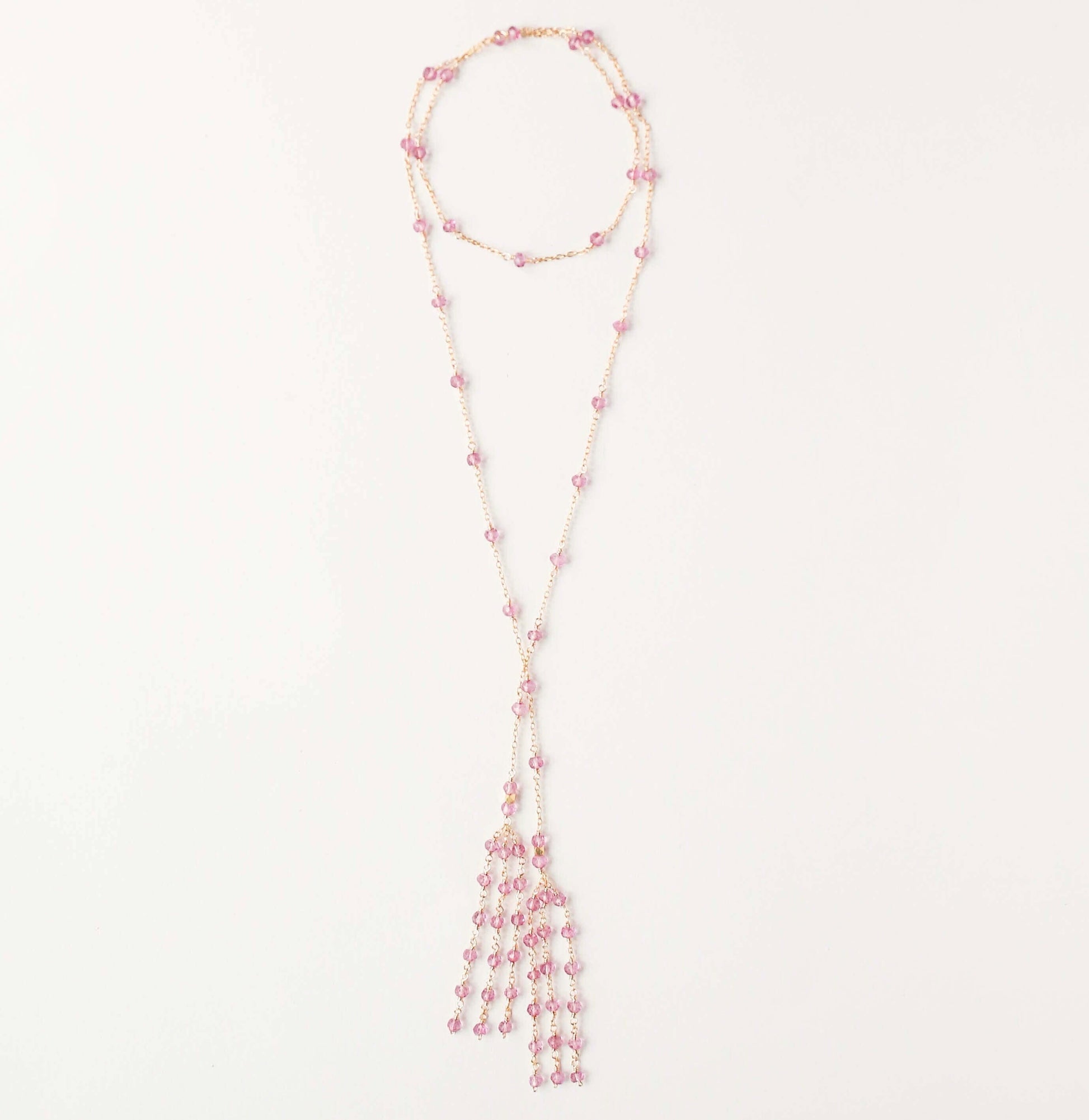 Delicate lariat necklace made with pink tourmaline gemstones and finished off with a beautiful tassel design. Designed as a shorter lariat so it falls mid-chest. We love to plate our silver jewelry with Rhodium so it won't tarnish and has a shine like white gold.