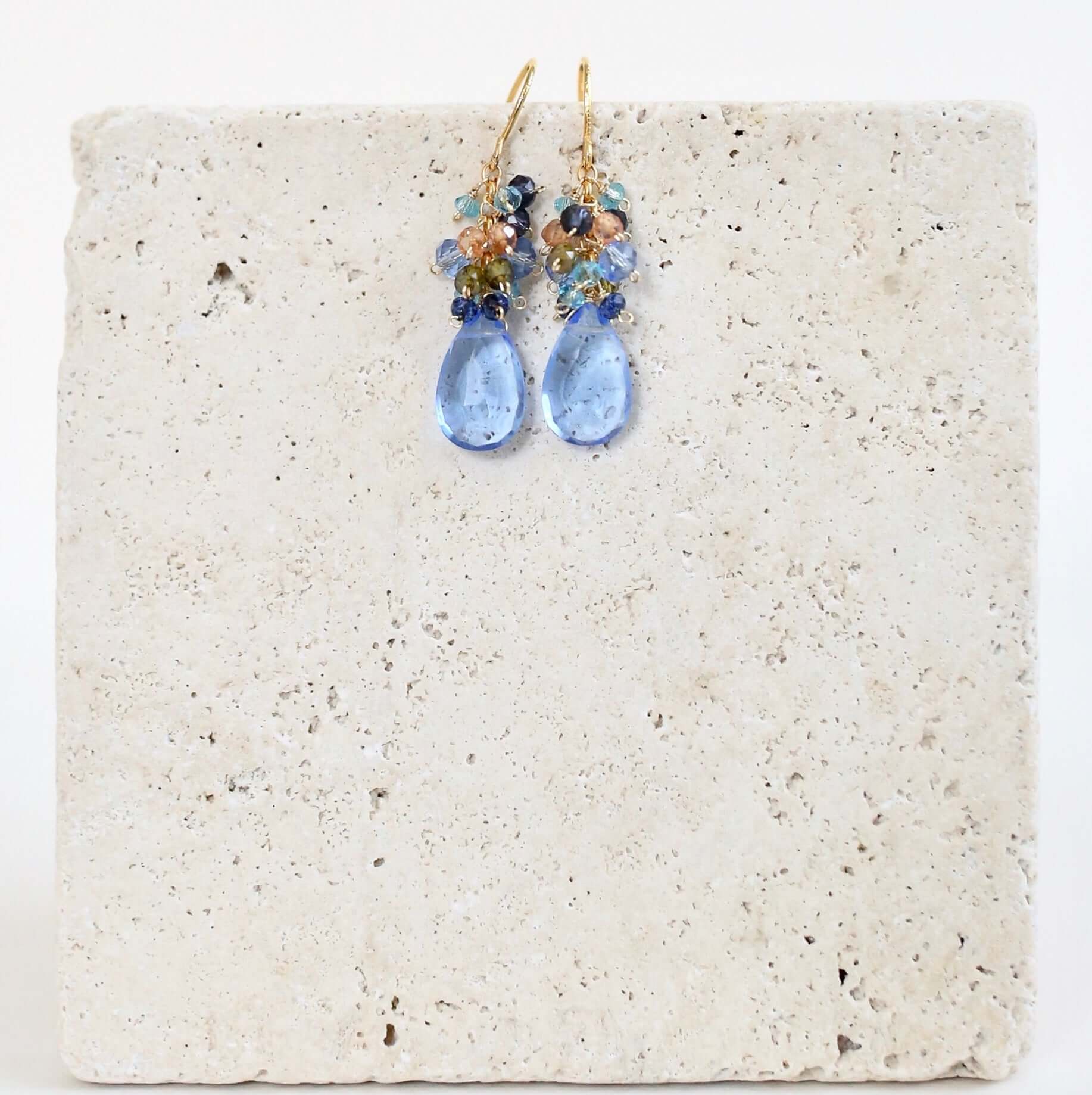 Stunning drops of color. Gold drop earrings made with sky blue quartz topped with a blue cluster of gems.