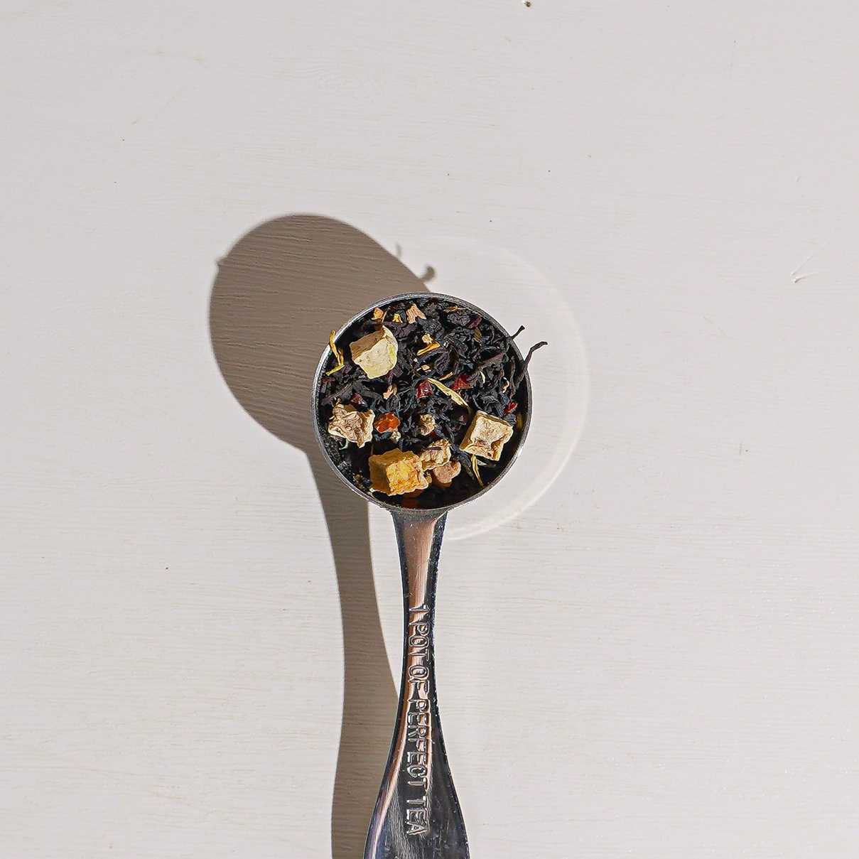 Dive into autumn bliss with Sleepy Hollow Pumpkin Chai. This inviting blend features robust black tea complemented by warming spices—ginger, cinnamon, cardamom, and a touch of pepper. Sweet apple, tart rosehip, and candy pieces add a delightful twist, while hibiscus, calendula, and sunflower petals bring a floral flourish. Perfect for a cozy, comforting sip that evokes the essence of pumpkin pie