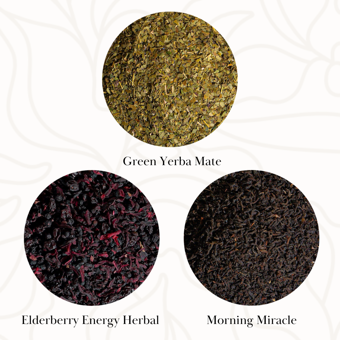 The Student Focus Trio is designed to give a boost to students and anyone who needs to maintain attention and diligence. It contains Elderberry Energy, Morning Miracle, and Green Yerba Mate Teas. Elderberry Energy, a customer favorite, provides delicious flavor, vitality, and energy. A full strength cup of Morning Miracle enables you to get up and go! A few cups can keep you energized throughout the day. Green Yerba Mate, which comes from the holly family, is delicious and smooth, and contains twice as much caffeine as tea. It is refreshing, invigorating, and rich in Vitamin C.