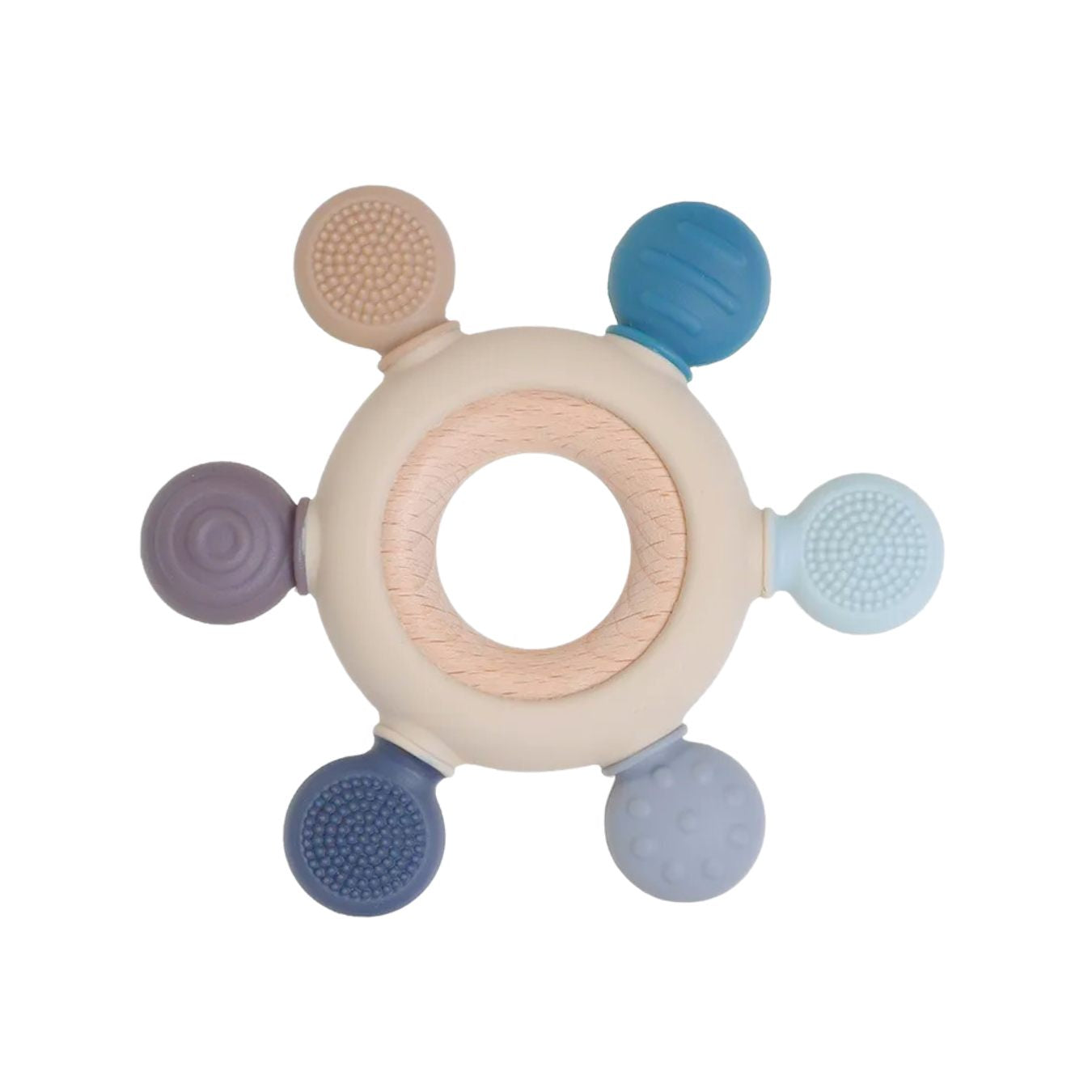 Our Teether Ring is composed of soft, soothing, silicone textures that give a calming sensation with an interior wooden ring. It is a top choice for baby showers and just the right size for little hands to hold.