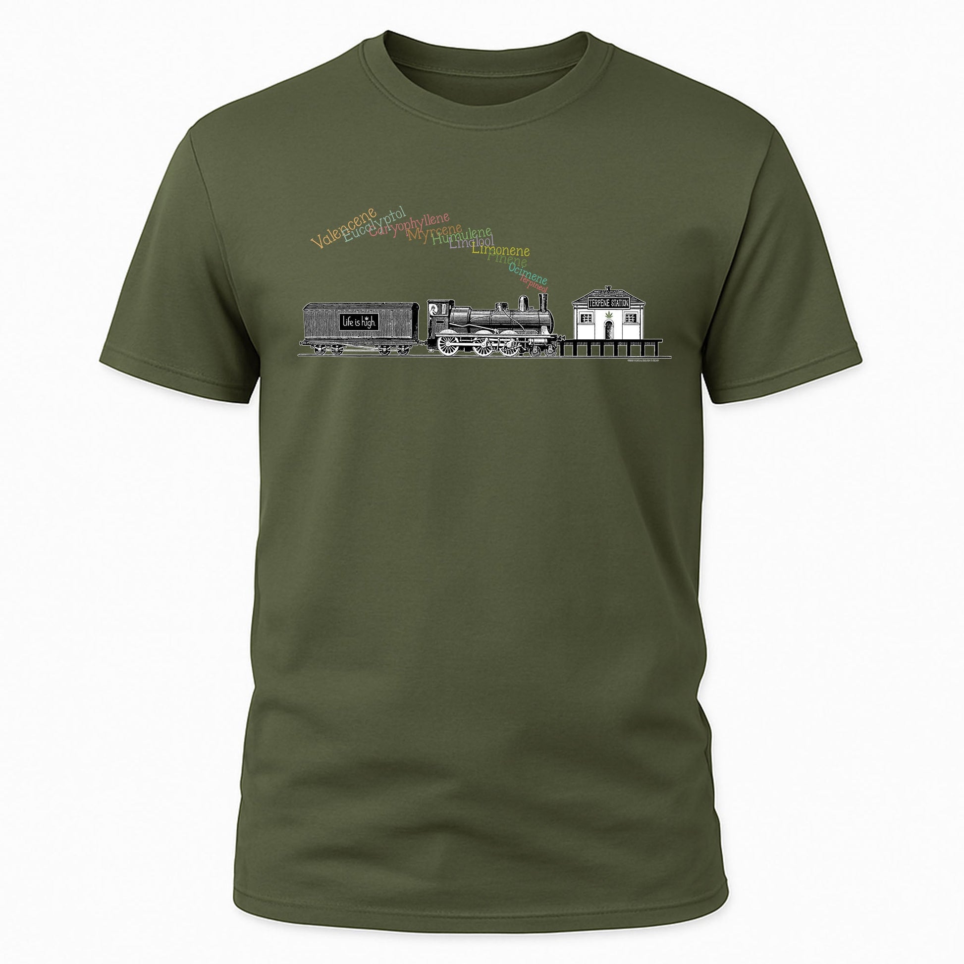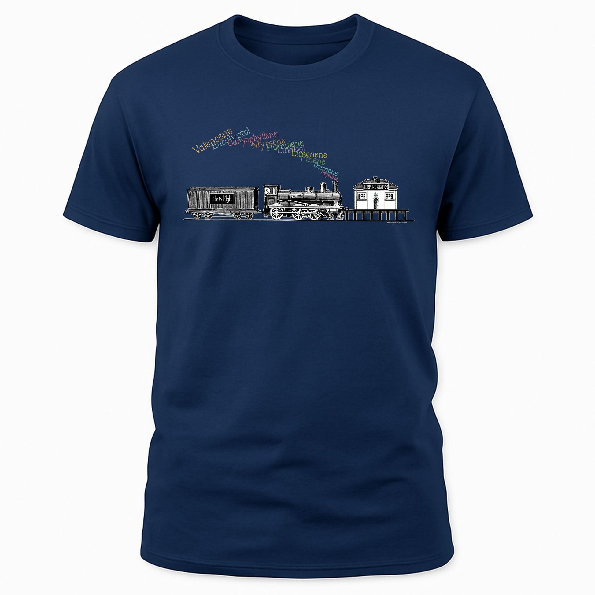 This design features a vintage steam locomotive pulling into a station, with a colorful steam cloud listing some of nature’s most beloved terpenes: Valencene, Eucalyptol, Caryophyllene, Myrcene, Terpineol, Limonene, and Ocimene. It’s science, style, and a little bit of whimsy — all on one shirt.