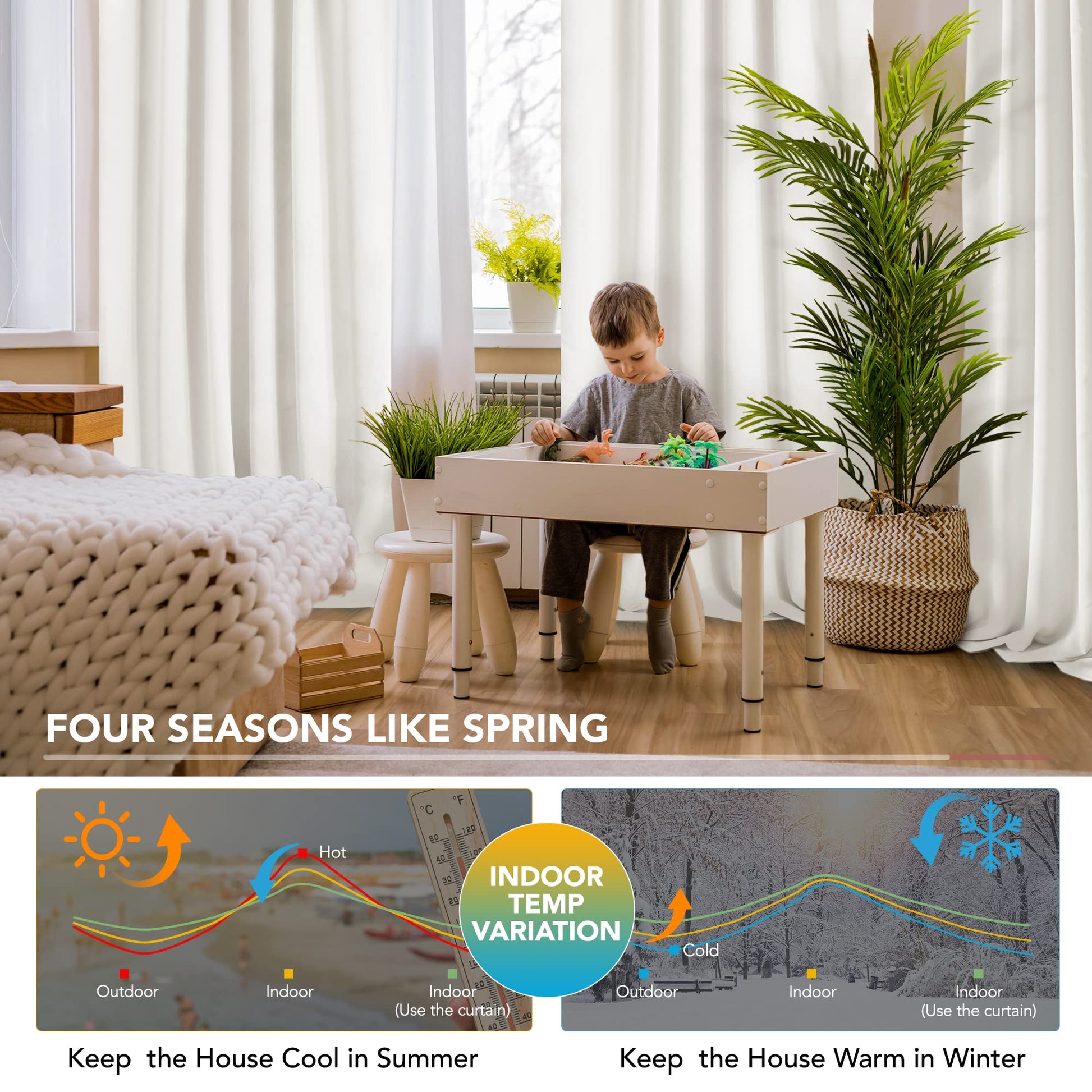 Thermal-insulated curtains help maintain consistent room temperature, saving energy by blocking heat in summer and retaining warmth in winter.