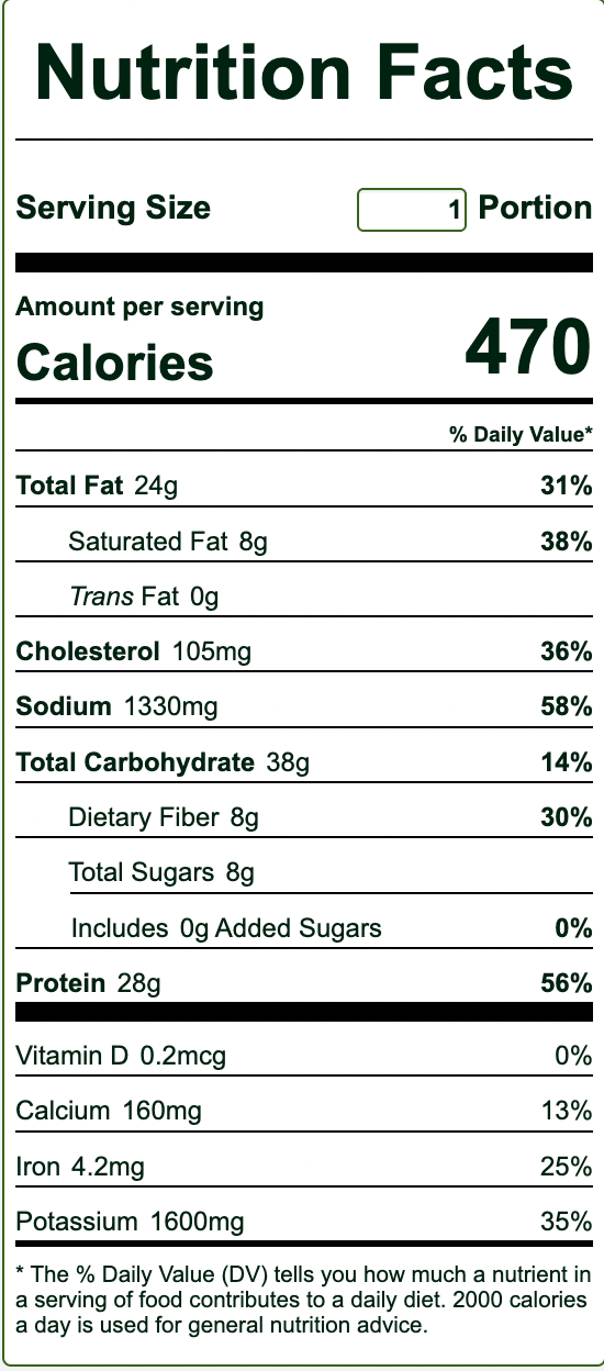 INGREDIENTS: Pasture raised chicken**, pasture raised AIP bacon**, onions*, brussels sprouts*, Garnet yams*, dino kale*,garlic*, nutritional yeast*, turmeric* cassava flour*, olive oil*, seasonal vegetable ferment*, wild flower honey*, thyme*, parsley*, Himalayan pink salt.