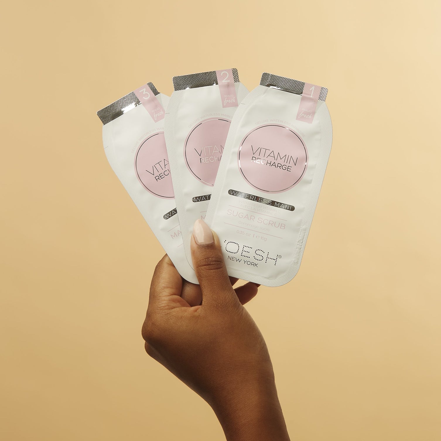 There's nothing a fresh manicure can't fix. Treat your tired hands with our Vitamin Recharge Mani in a Box Waterless 3 Step. This all-in-one spa manicure kit is infused with Vitamin C to experience a burst of freshness and deliver happy skin! Nothing improves your mood like a good manicure. Indulge in some me-time and pamper your hands with our Vitamin Recharge manicure! Infused with natural pink grapefruit extract, this hand treatment revitalizes both skin and senses to make you look and feel refreshed. This easy, skin-vigorating mani makes self-care so simple, you'll look forward to giving yourself me-time on the regular.