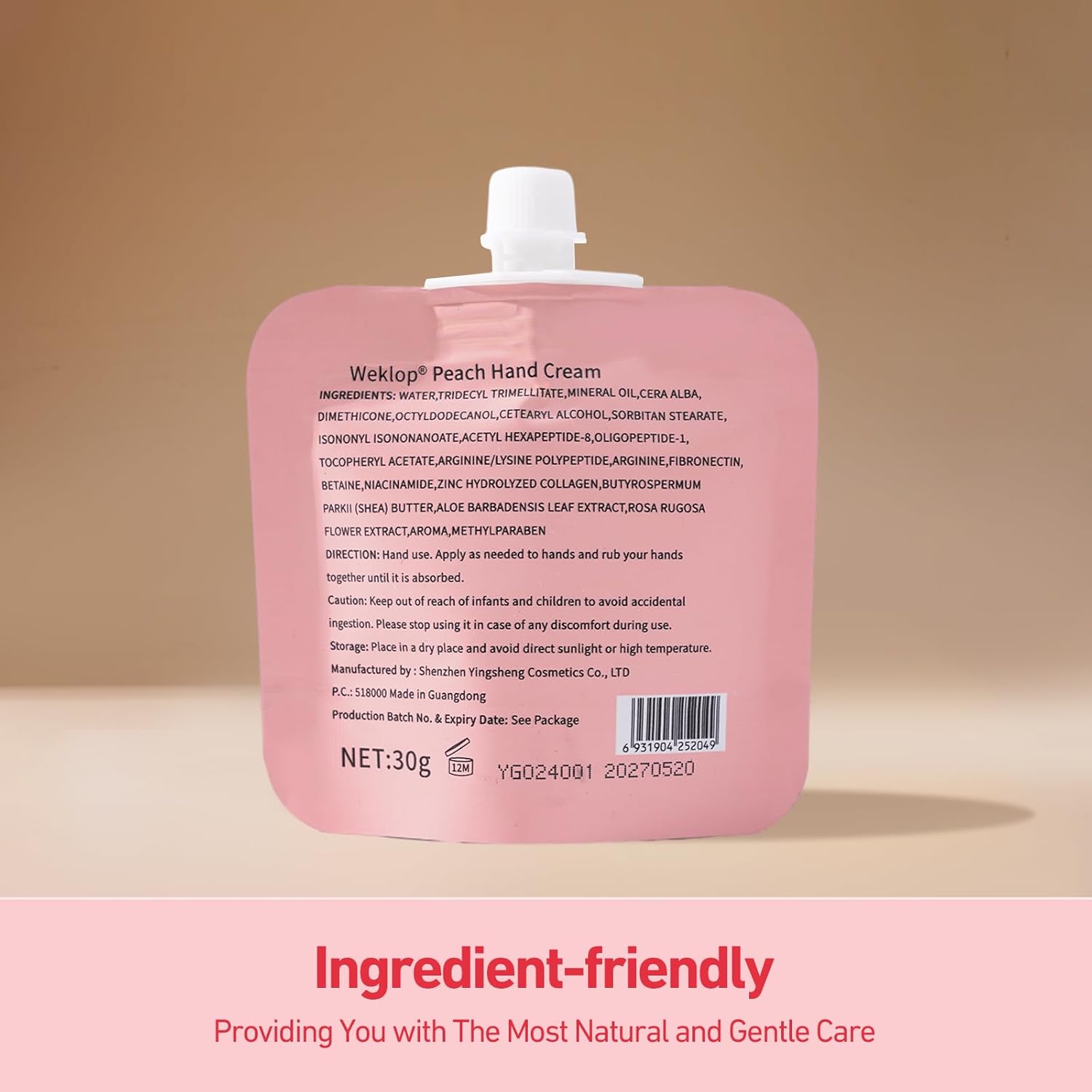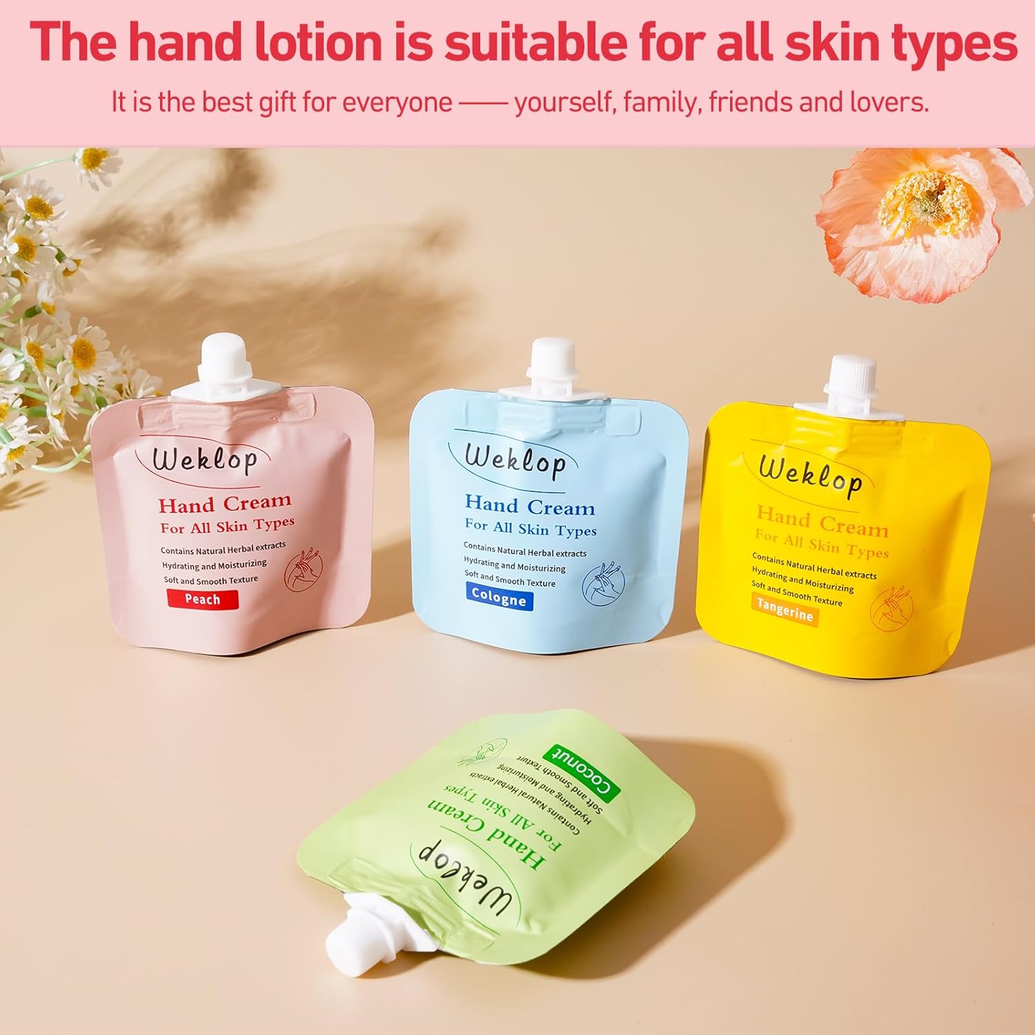 Pamper your hands anytime, anywhere with the WEKLOP Natural Moisturizing Travel Size Hand Cream four-piece set. This cute and dainty set features three fruity scents, Peach, Tangerine, Coconut, and a special Cologne scent, perfect for matching your perfume on special occasions. The fresh and sweet fragrances of the fruit creams make everyday hand care a delightful ritual.