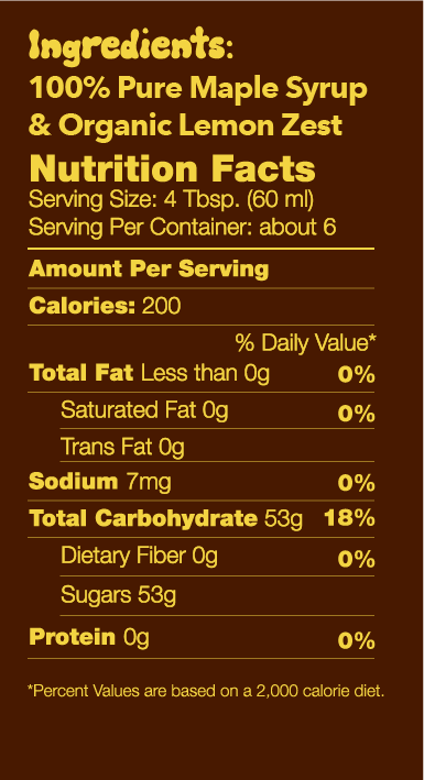 INGREDIENTS: 100% Pure Maple Syrup, Organic Lemon Zest