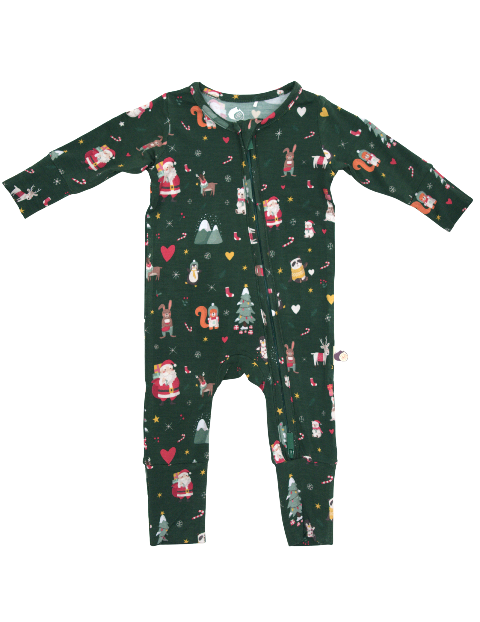 Our Woodland Christmas Bamboo Rompers are super cute with an adorable holiday print featuring Santa clause, Christmas tree and lots of cute woodland animals on a dark emerald background.